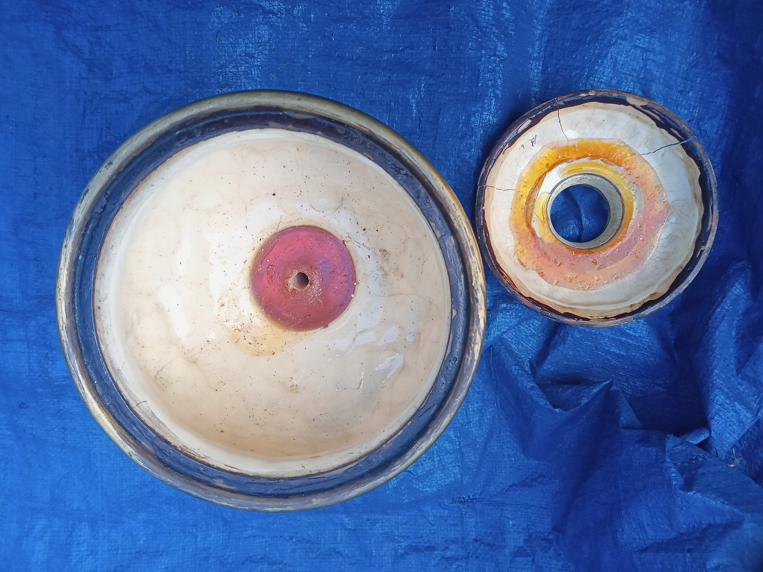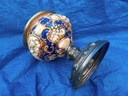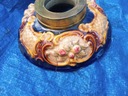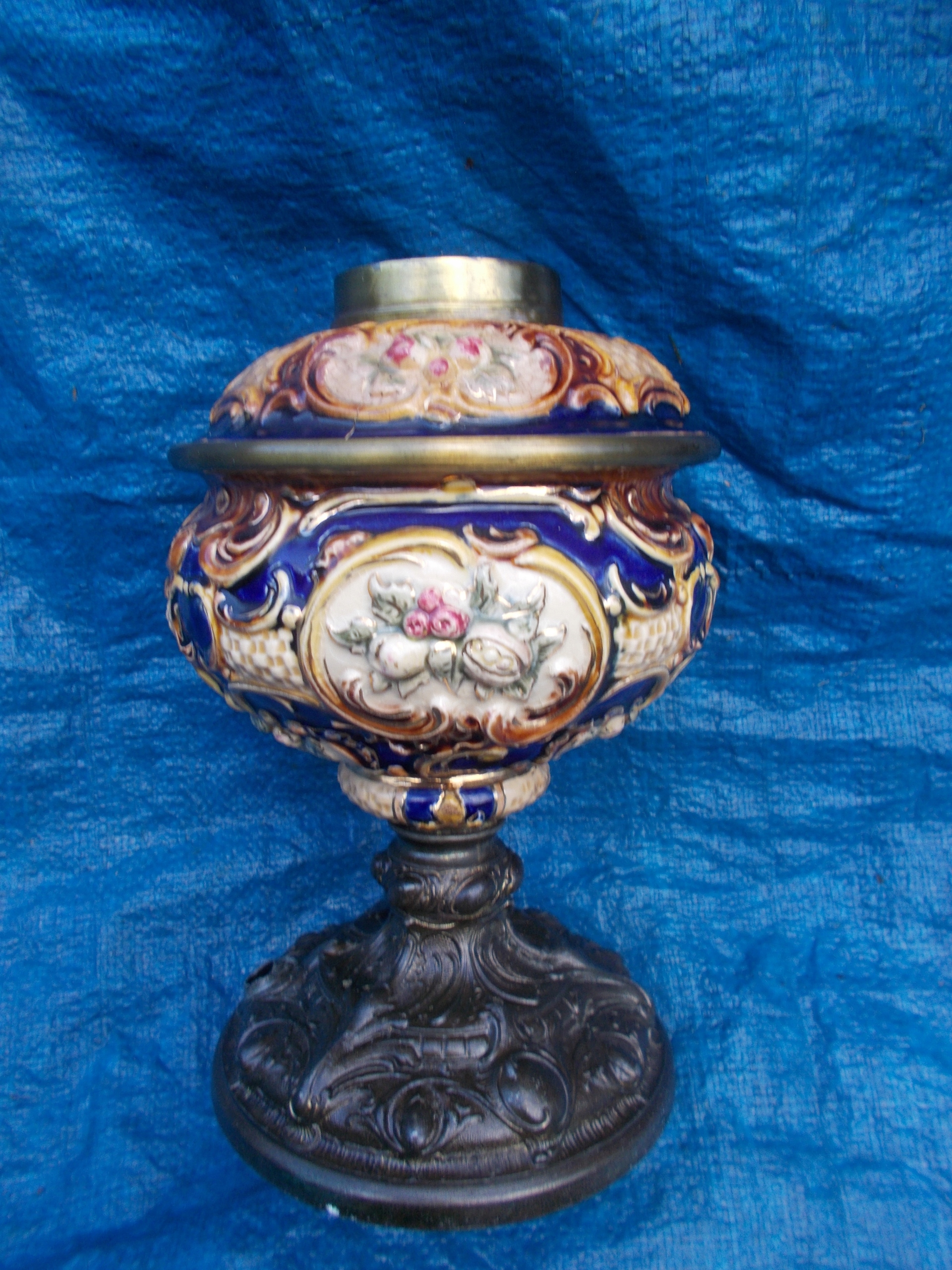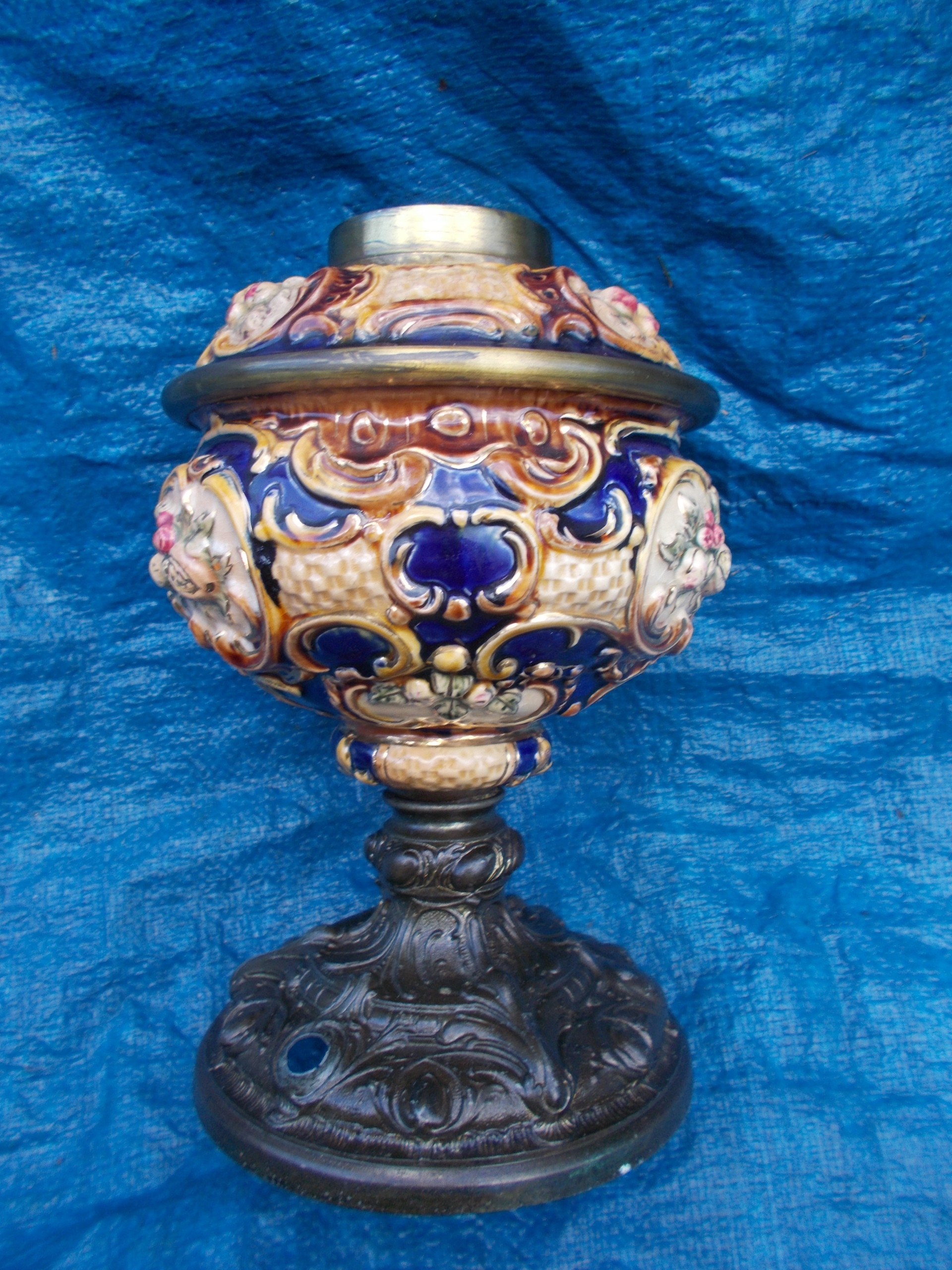 wysokość ok. 24 cm , średnica ok. 15 cm , gwint 39 mm , w przeszłości poszczególne elementy zostały z sobą sklejone , nie wiem czy pokrywa jest od tej lampy ale jest bardzo do niej podobna , jest trochę bardziej pożółkła i idealnie nie jest osadzona w pierścieniu dolnej części , 3 pęknięcia na pokrywie po sklejeniu i ściśnięciu będą mniej widoczne niż na zdjęciach , w dolnej części jest pęknięcie - zdjęcie numer 10 ale z zewnątrz po postawieniu lampy właściwie nie jest widoczne , dwa otwory nawiercone w podstawie , lampa sprawia wrażenie lekko skrzywionej , odcień majoliki nie jest aż tak intensywny jak na zdjęciach , majolika ładnie zdobiona i kolorowa , stan zachowania jak na zdjęciach