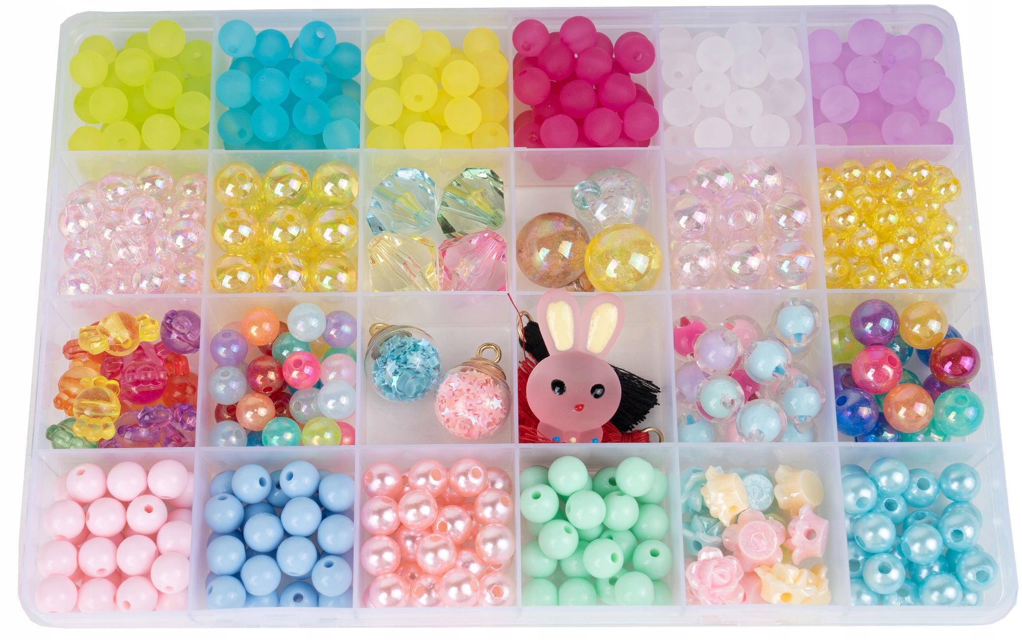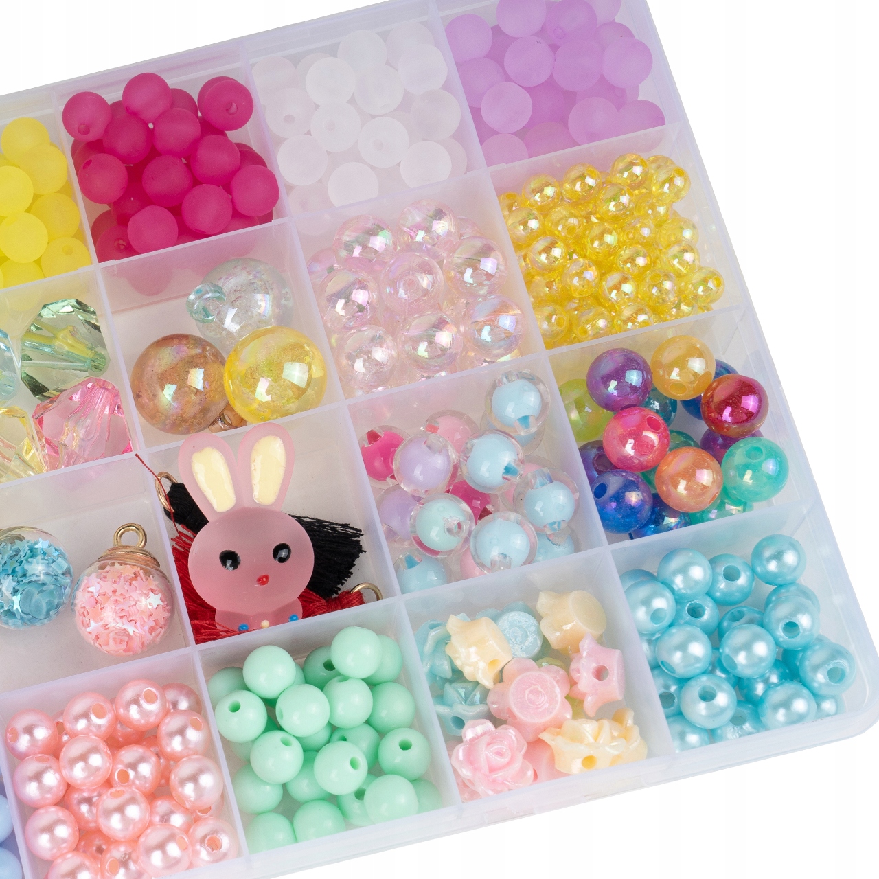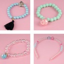 Zestaw zawiera mnóstwo koralików w przeróżnych kształtach. Wszystkie elementy można nawlekać na przeźroczystą żyłkę lub kolorowy sznureczek oraz na jedną z dwóch opasek do włosów.