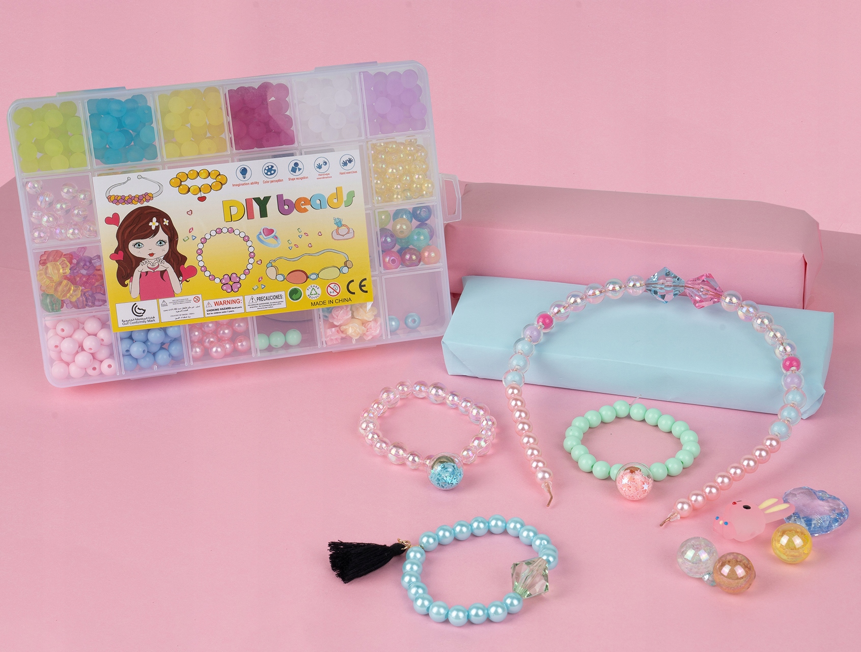 Prawie każda dziewczynka uwielbia biżuterie, błyskotki, koralki, zawieszki. Prezentowany zestaw do tworzenia bransoletek i opasek jest idealnym prezentem dla małej księżniczki, która zamieni się w prawdziwą kreatorkę mody