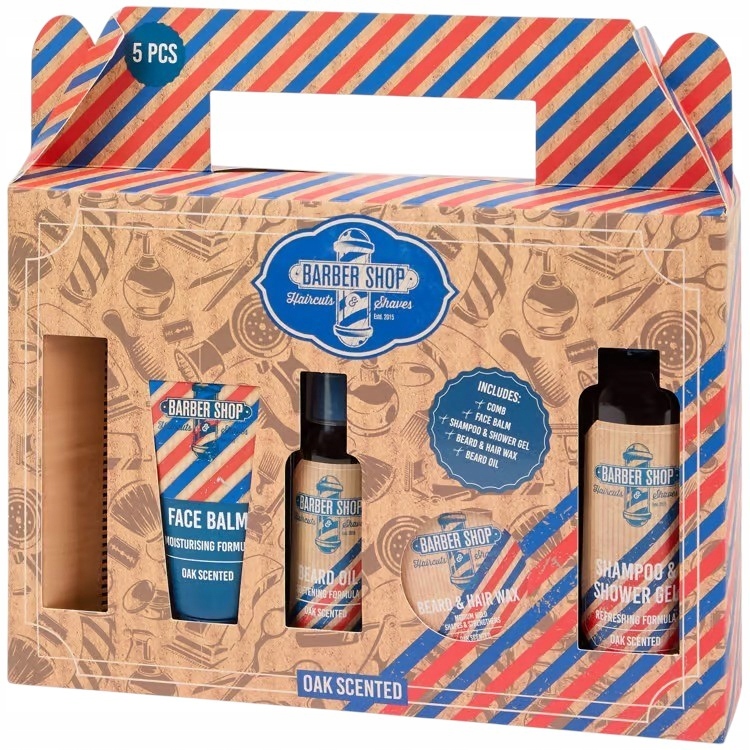 Barbershop to zestaw czterech kosmetyków niezbędnych do utrzymania brody, włosów i twarzy w dobrej kondycji. Utrzymuje zarost czystym i dobrze odżywionym przez cały dzień. Dodatkowo nawilża skórę twarzy. Stylowe opakowanie i elegancki zapach sprawiają, iż zestaw staje się wyjątkowym prezentem dla każdego brodacza!