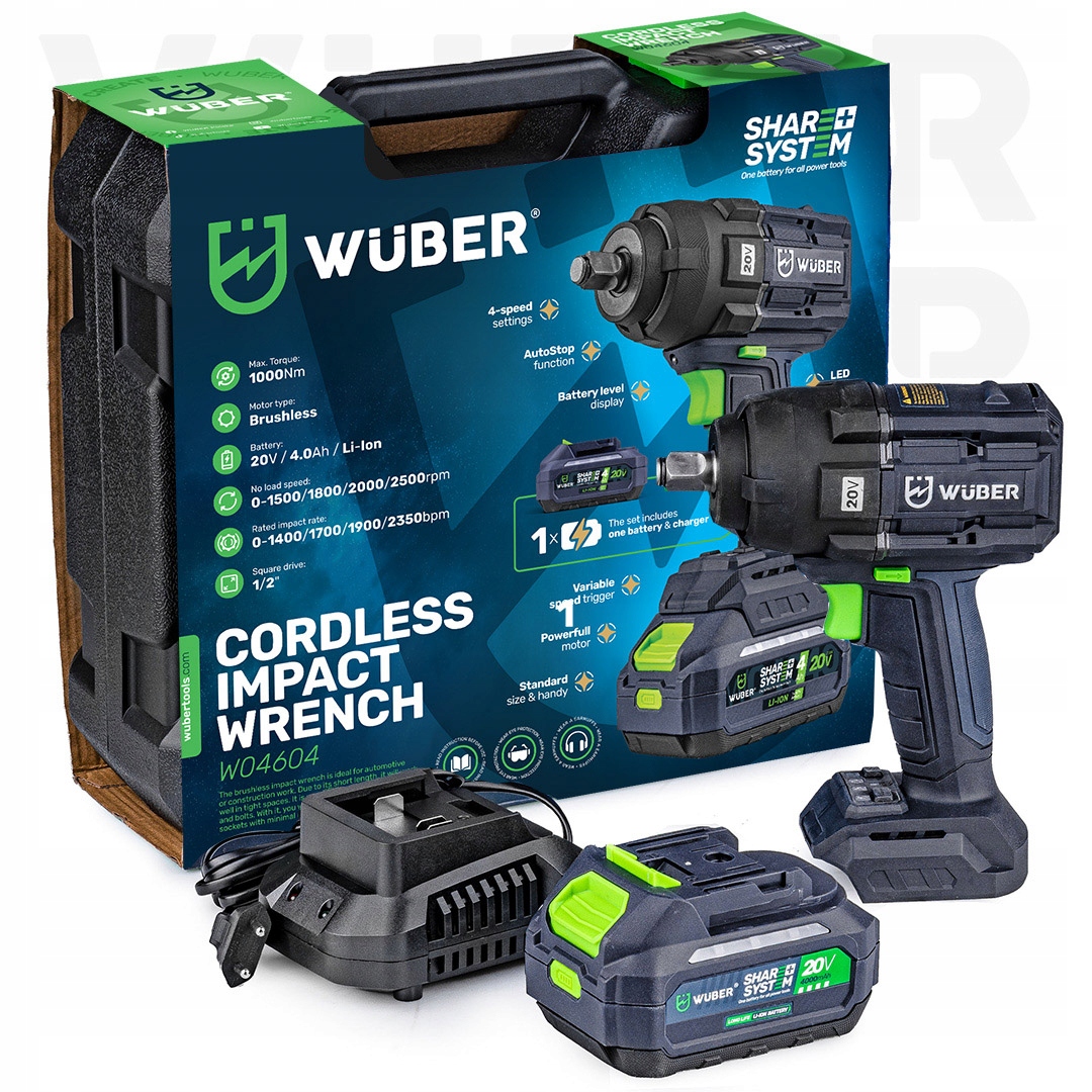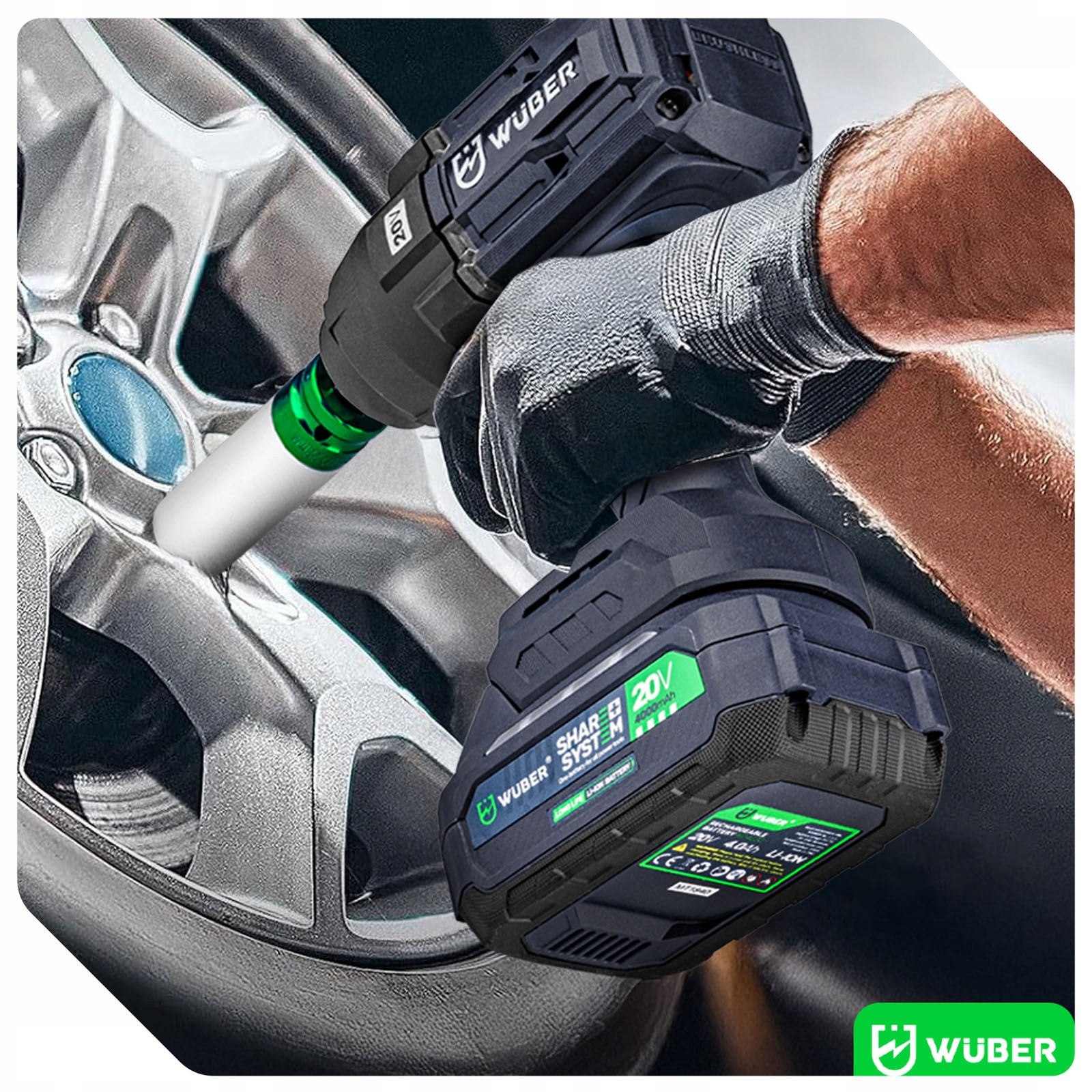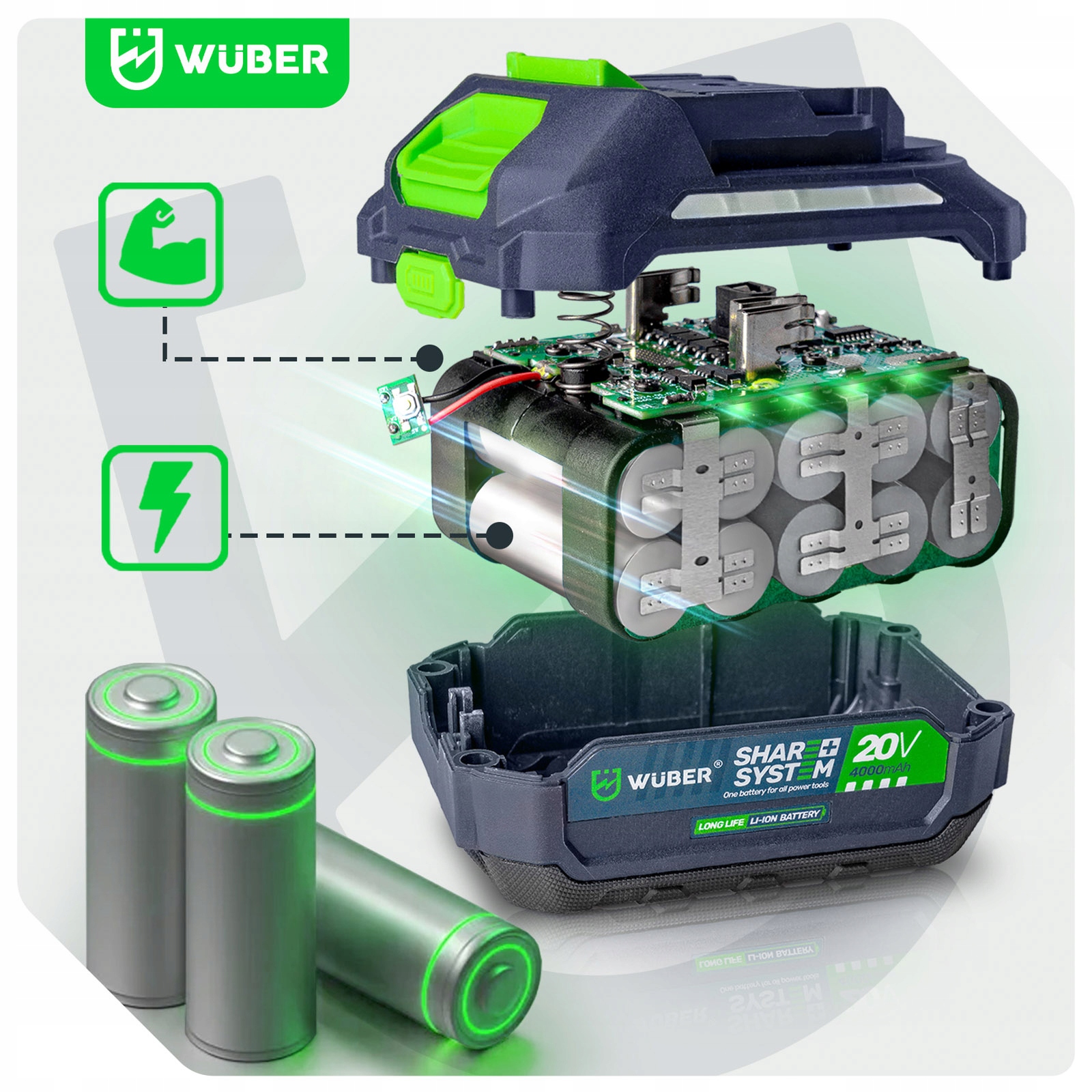 Wuber share + system to dedykowana linia elektronarzędzi napędzanych UNIWERSALNYMI AKUMULATORAMI o dużej pojemności i jednakowym napięciu, pasującymi do WSZYSTKICH urządzeń z tej serii