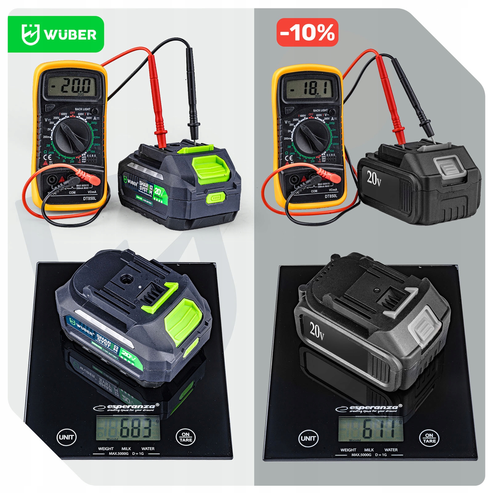 Wiele kluczy udarowych na rynku deklaruje „20V”, ale w rzeczywistości ich akumulatory pracują na 18V (spadek napięcia pod obciążeniem to nawet 15%)