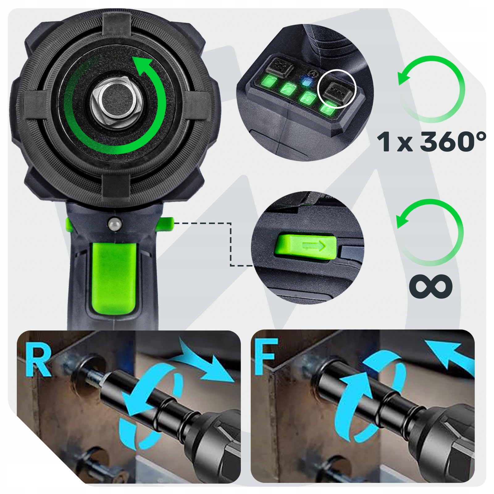 ✅ Smart-Loosening Mode ► unikalny tryb odkręcania, w którym klucz wykonuje jeden pełny obrót (360°), delikatnie poluzowując nawet najbardziej zaciśnięte śruby bez ryzyka uszkodzenia gwintu