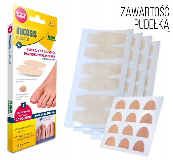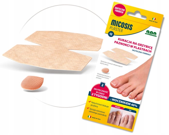 Opatrunek MYCOSIS jest innowacyjnym, szybkim i wygodnym sposobem kuracji grzybicy paznokcia. Zawiera wysoką zawartość mocznika (40 %), te ergonomiczne antygrzybiczne plastry o natychmiastowym działaniu, zatrzymują infekcję i zmiękczają zaatakowany obszar paznokcia dzięki czemu jest łatwiejszy do wycięcia.