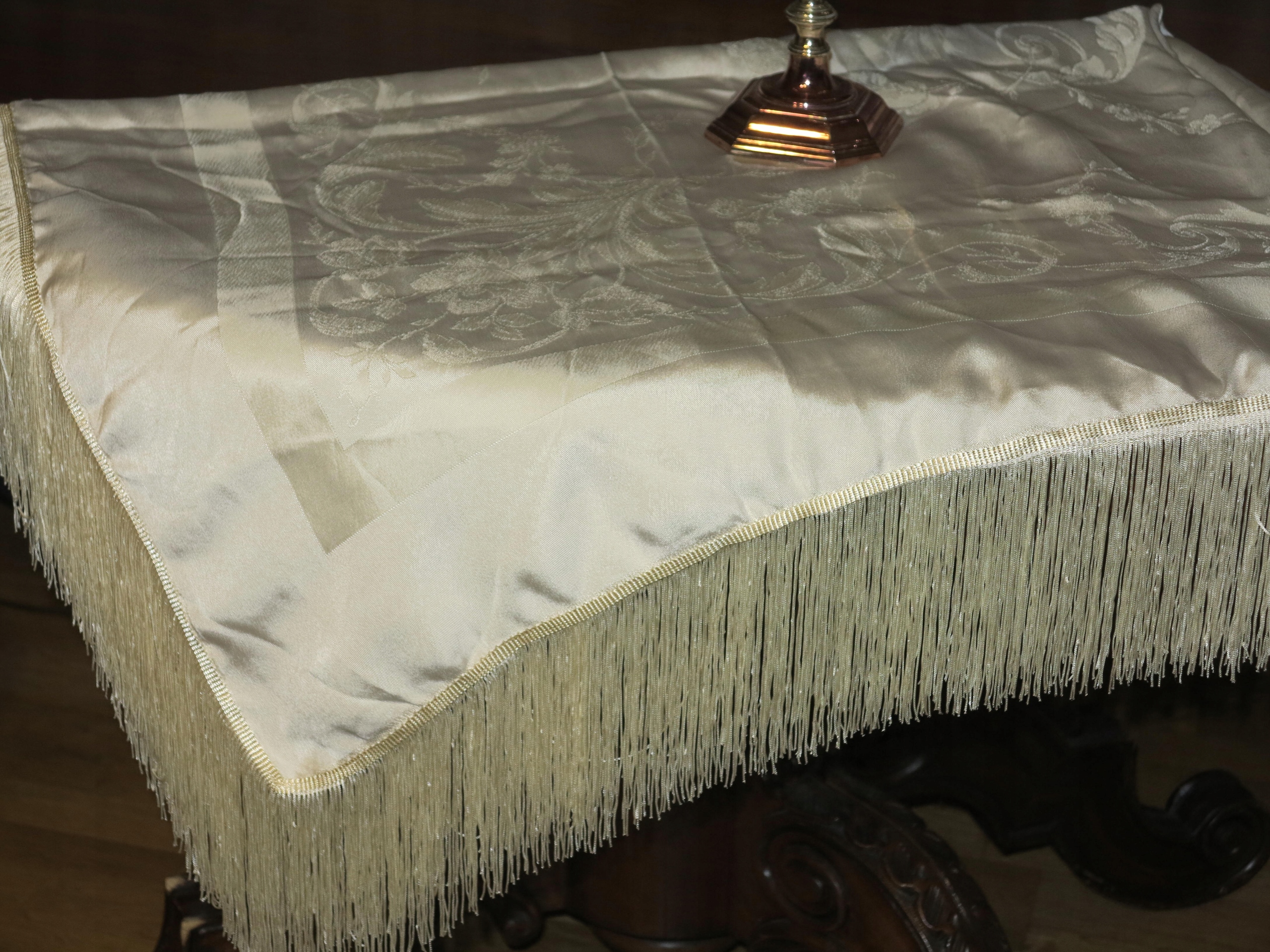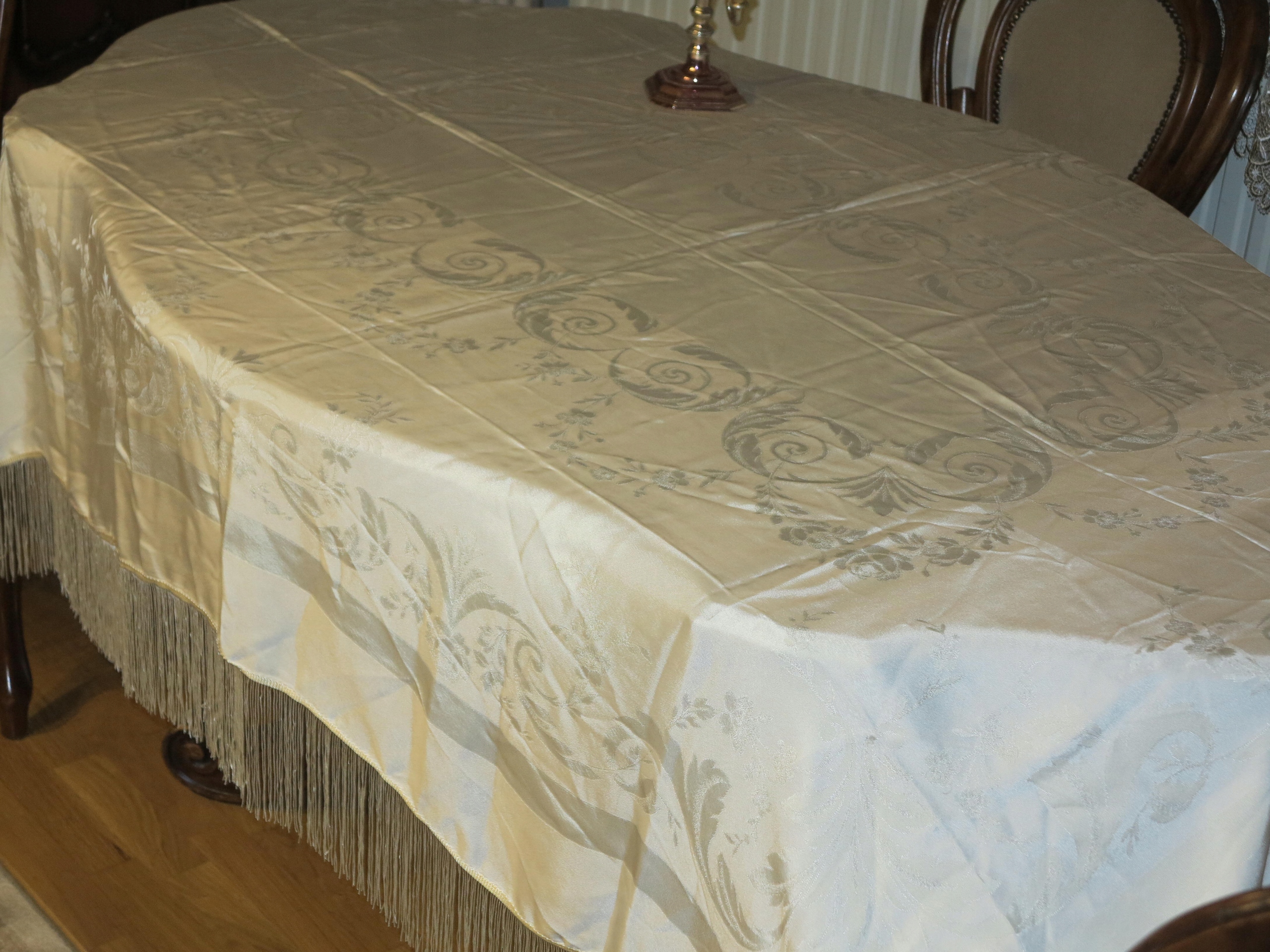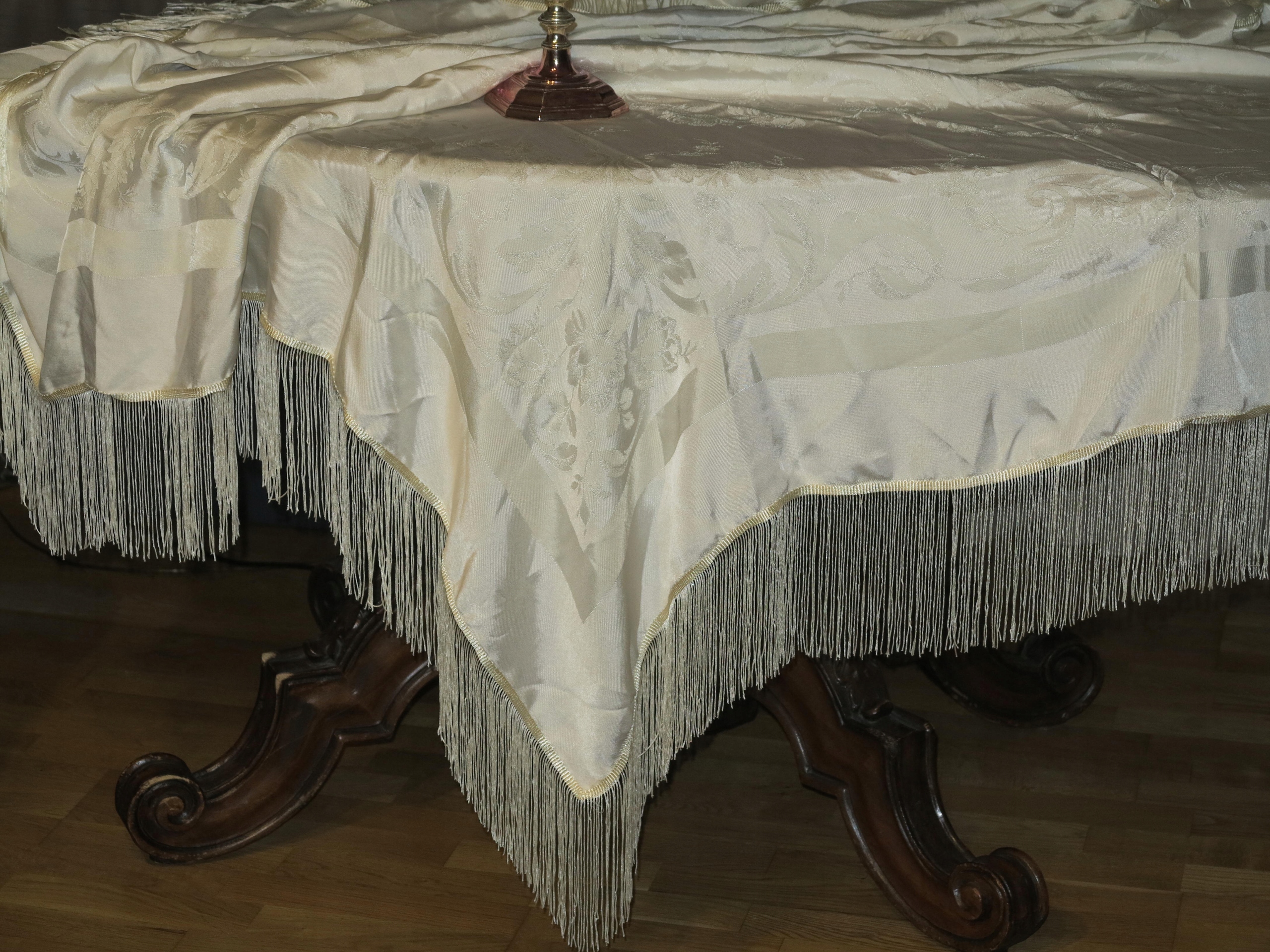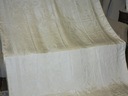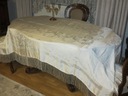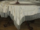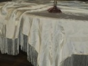 NIEZWYKLE PIĘKNY DUŻY OBRUS Z LEJĄCEGO JEDWABNEGO ADAMASZKU. OBRUS NA OKOŁO ZDOBIONY DŁUGIMI, LEJĄCYMI, JEDWABNYMI FRĘDZLAMI. KOLOR ECRU NA OBRUSIE PIĘKNE STYLOWE WZORY