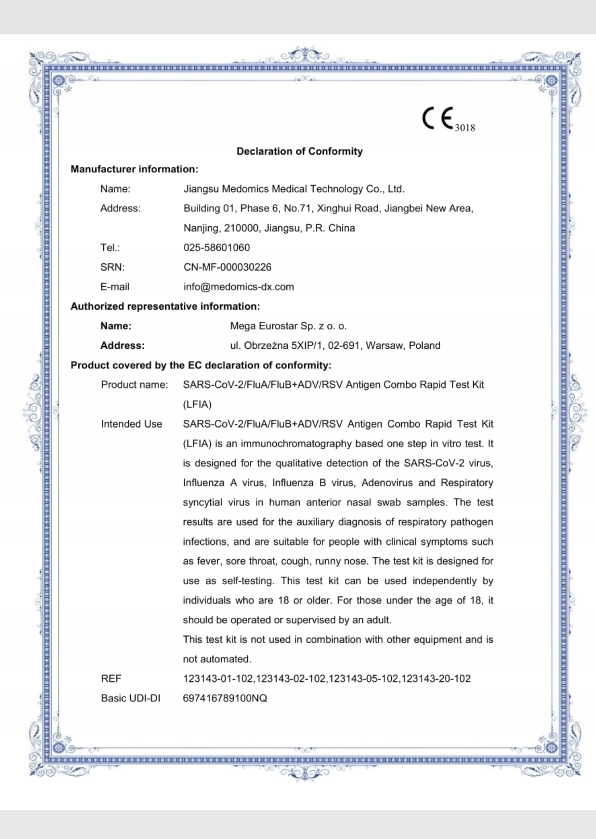 Medomics COMBO to nowoczesny test antygenowy przeznaczony do wykrywania pięciu kluczowych patogenów układu oddechowego: SARS-CoV-2, grypy A, grypy B, RSV i adenowirusa – wszystko w jednym badaniu. Ten test combo 5w1 umożliwia szybką i skuteczną diagnostykę infekcji wirusowych w warunkach domowych. Dzięki zastosowaniu technologii LFIA (immunochromatografia ze złotem koloidalnym), wynik testu dostępny jest już po 15 minutach. Test combo pozwala na jednoczesną ocenę zakażeń sezonowych i wirusów wywołujących ostre objawy grypopodobne. Produkt posiada certyfikaty zgodności i został dopuszczony do obrotu na terenie UE jako wyrób medyczny do samokontroli. Test może być wykonany przez osoby dorosłe, a w przypadku dzieci – pod nadzorem opiekuna.