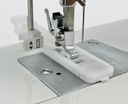 W maszynie można zastosować różne stopki zadaniowe. Ich wymiana jest bardzo łatwa. Naciskając na dźwignię z tyłu zwalniamy blokadę, stopka odepnie się. W jej miejsce podkładamy nową stopkę i używając dźwignię do podnoszenia/opuszczania stopki powoli opuszczamy ją w dół, tak aby stopka przypięła się do zaczepu.