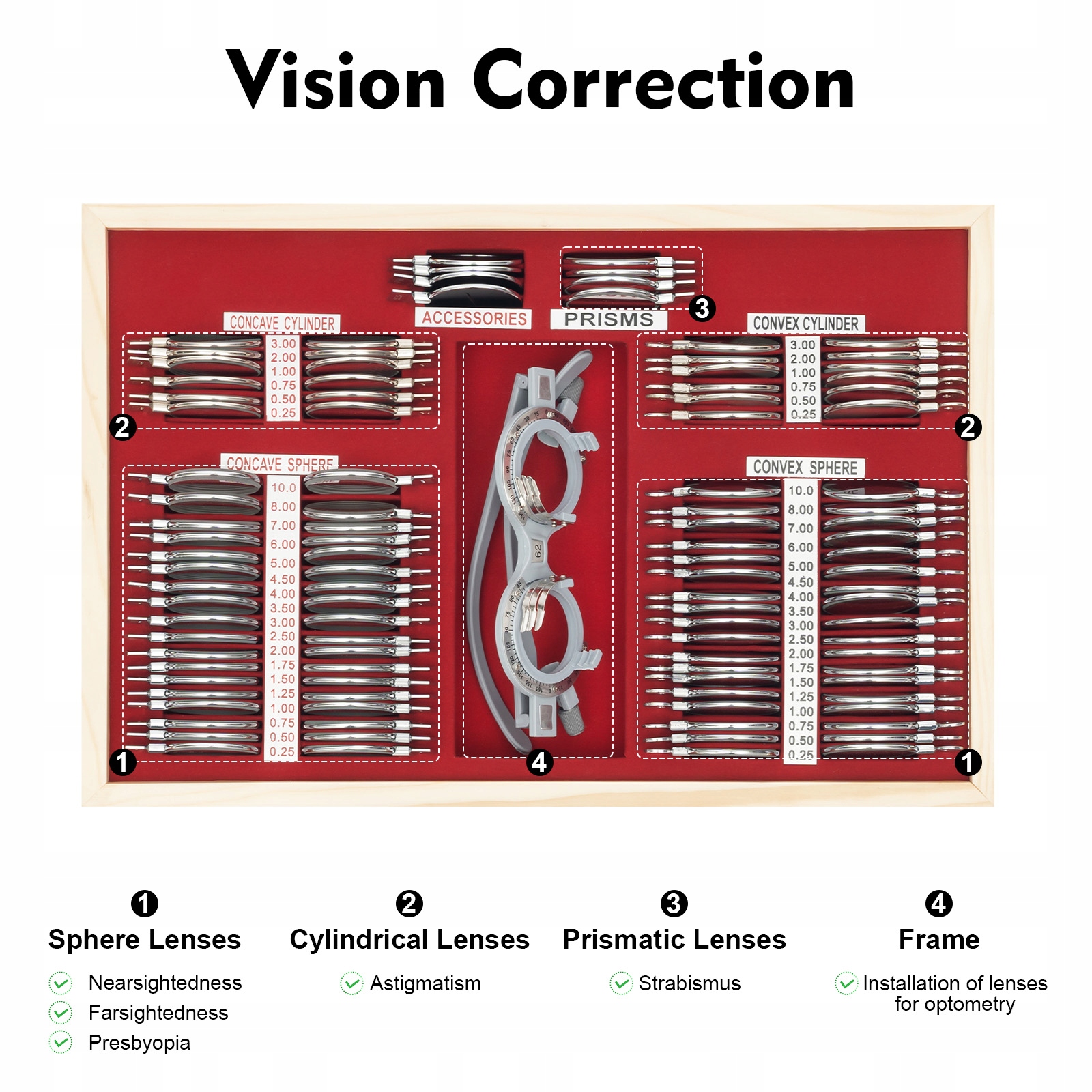 ✅✅Korekcja wzroku: Soczewki Sphere mogą być używane do korygowania krótkowzroczności, dalekowzroczności i starczowzroczności. Soczewki cylindryczne mogą być stosowane do korygowania astygmatyzmu. Soczewki pryzmatyczne służą do sprawdzania i korygowania strabismusa lub heteroporii. Ponadto szklane soczewki z metalowymi krawędziami zapewniają dokładne załamanie i wysoką transmisję światła dla optometrii.