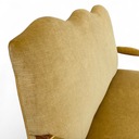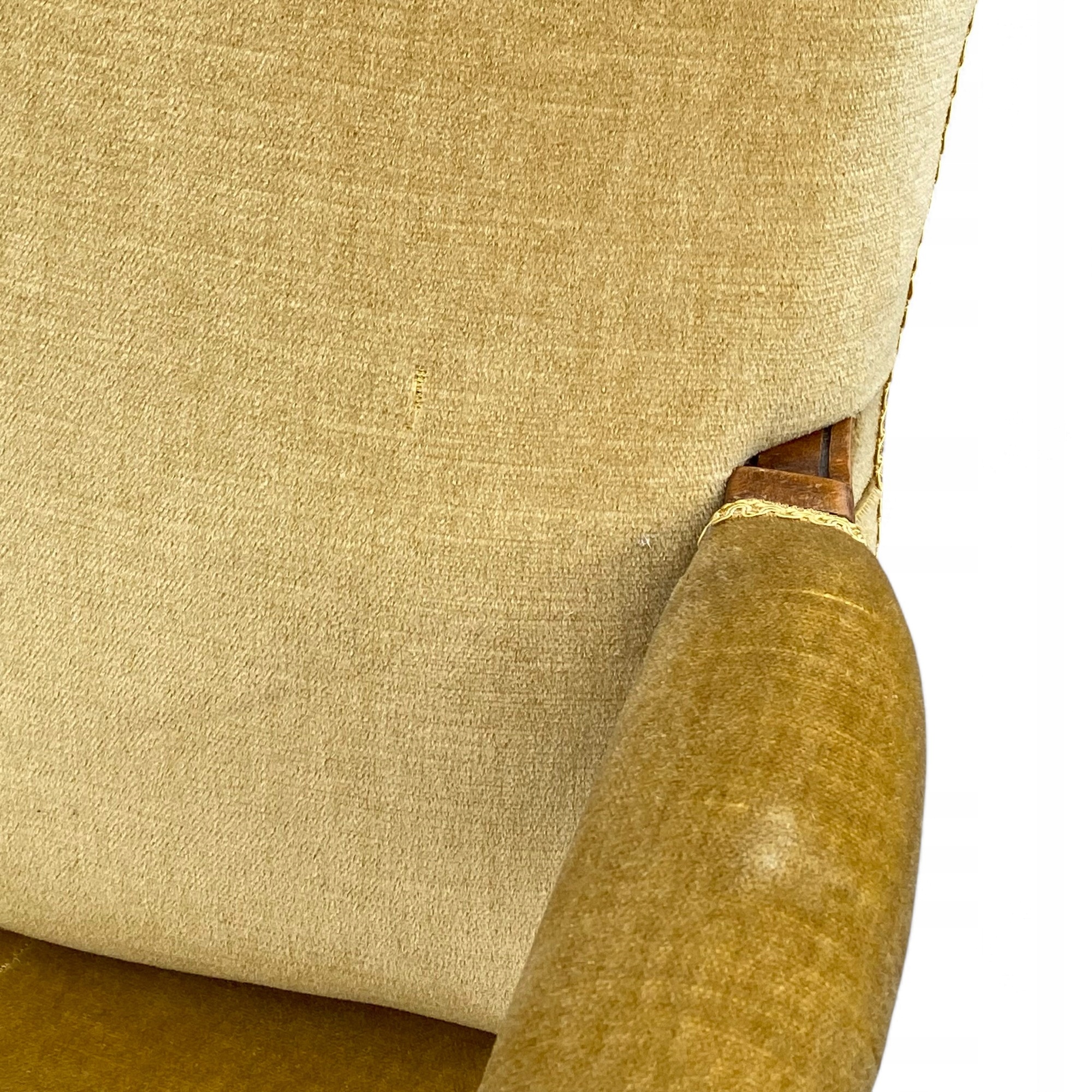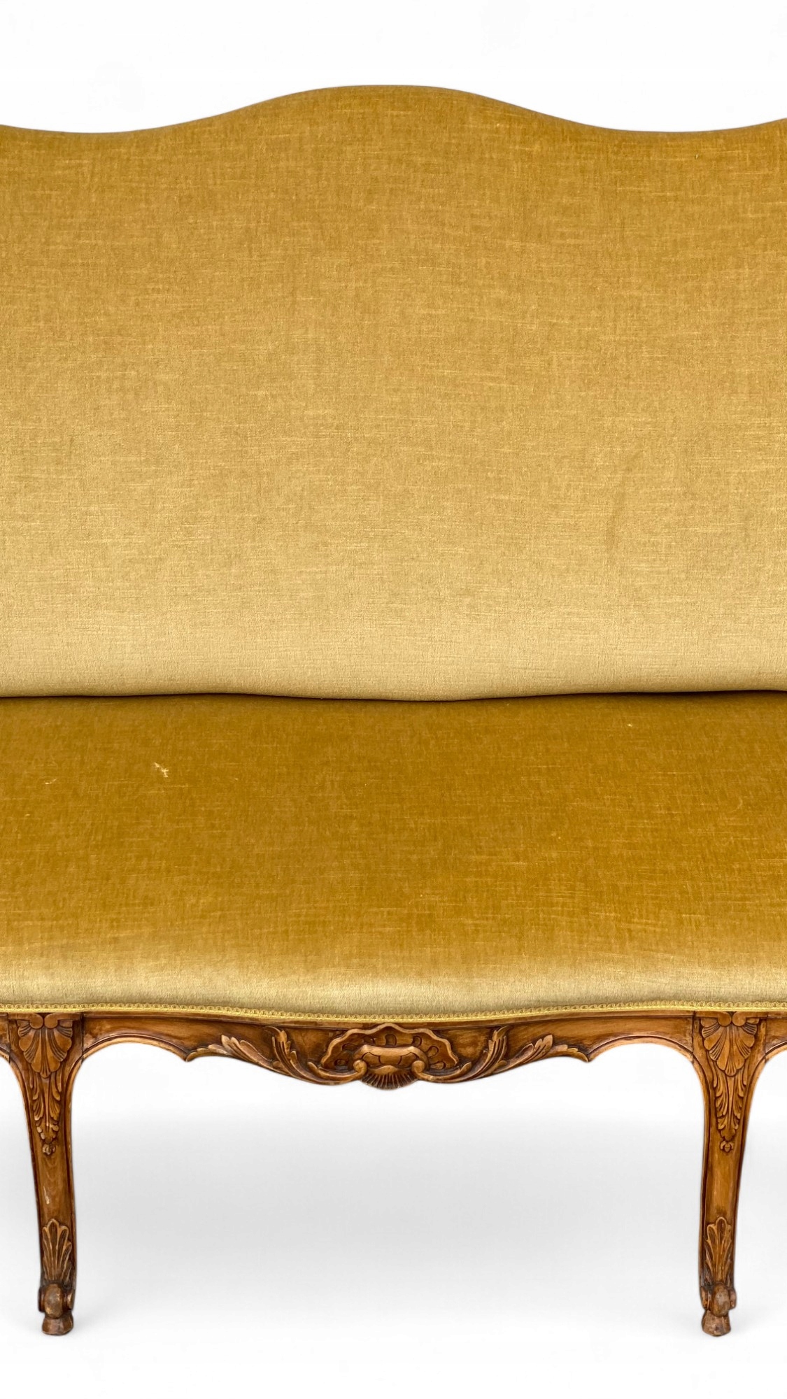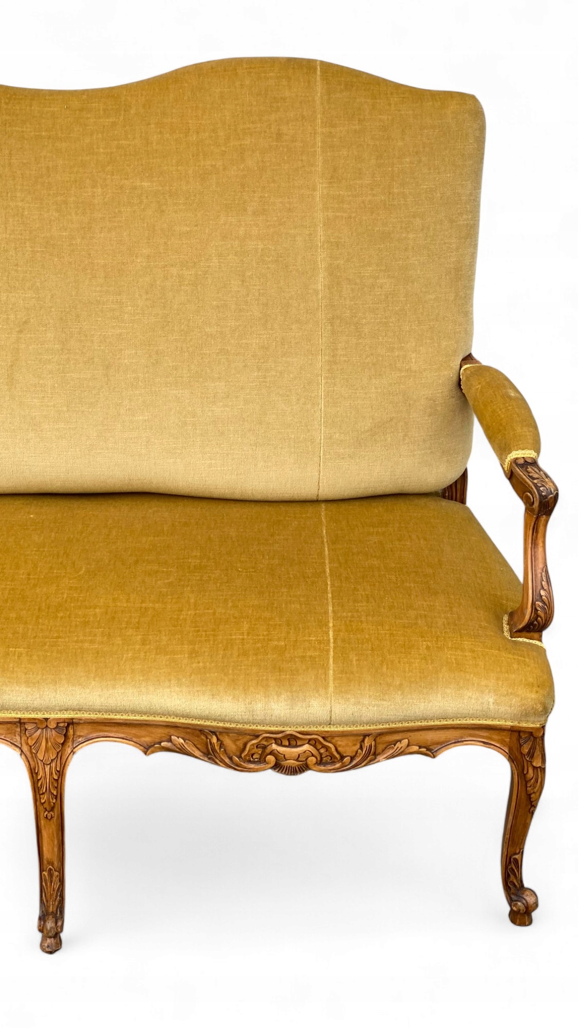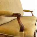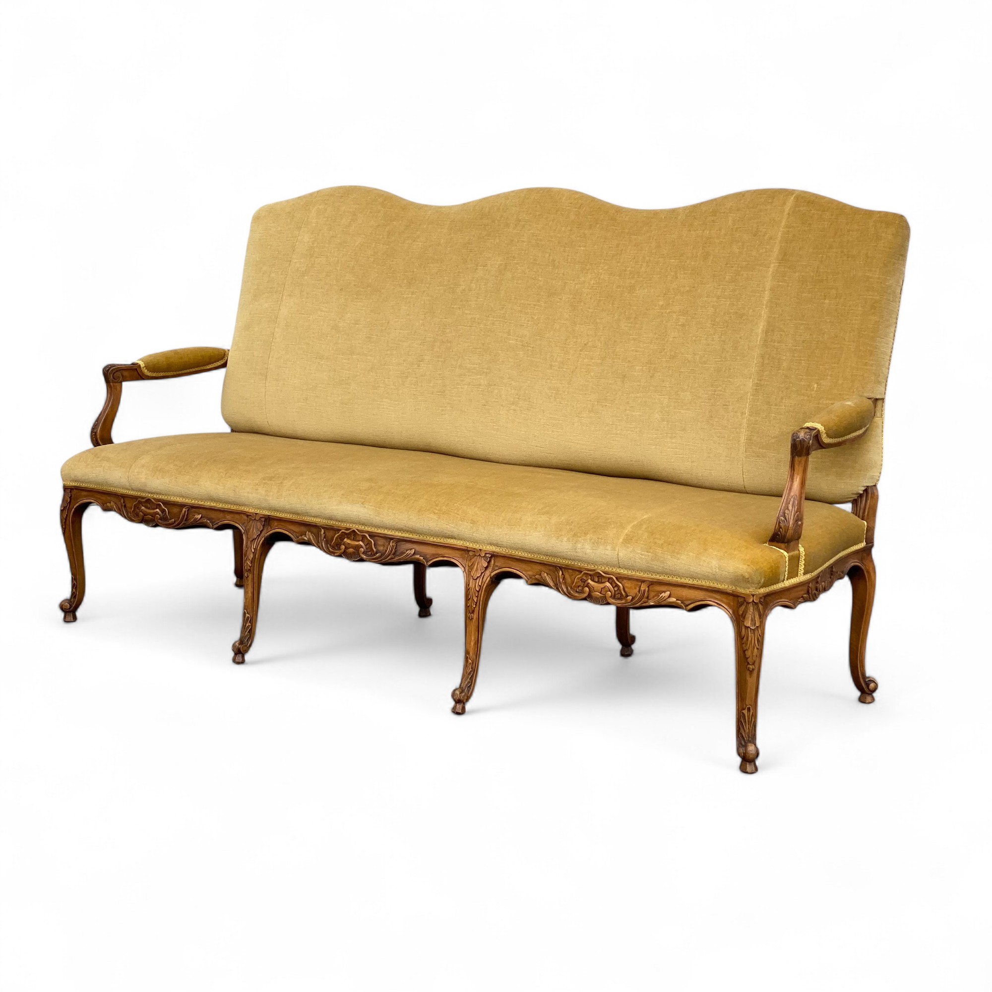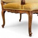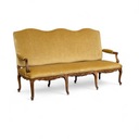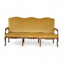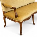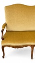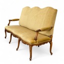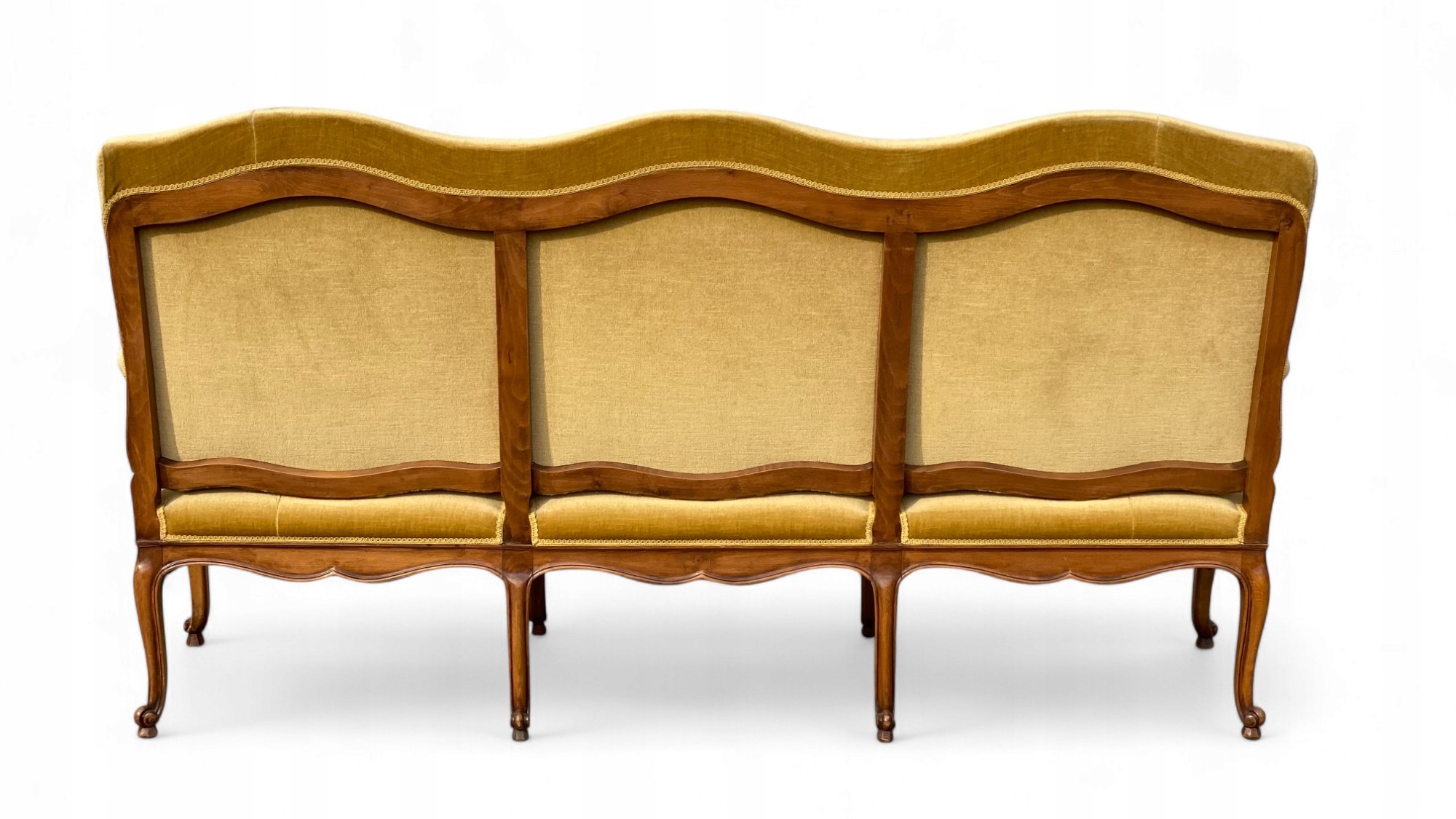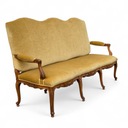 Trzyosobowa sofa w stylu ludwikowskim, osadzona na giętych rzeźbionych nogach w kolorze orzecha.