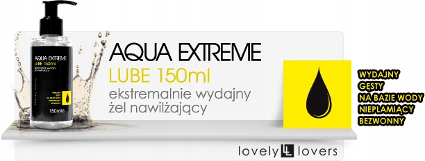 INTENSYWNY I DŁUGI STOSUNEKdzięki wyjątkowej gęstości i wydajności żel zaspokoi nawet najbardziej wymagającychFISTING I INNE...ekstremalne nawilżenie jakie zapewnia AQUA EXTREME jest idealne do różnych zabaw w tym nawet fistinguNAWILŻENIE AKCESORIÓWmimo wydajności żelu stworzonego na bazie silikonu AQUA EXTREME jest żelem wodnym, dzięki czemu jest bezpieczny dla wszelkich akcesoriów erotycznych
