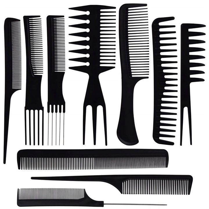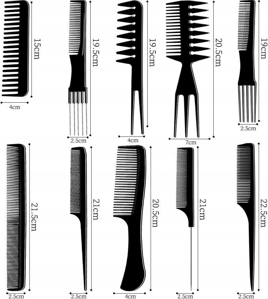 Profesjonalne grzebienie fryzjerskie do rozczesywania i układania włosów zapakowane w praktyczne etui. Zestaw zawiera 10 grzebieni fryzjerskich niezbędnych w codziennej pracy przy stanowisku fryzjerskim. Grzebienie są odporne na ciepło z suszarki. Taki komplet zapewnia stworzenie niemal każdej fryzury w salonie fryzjerskim, jak i również w warunkach domowych.
