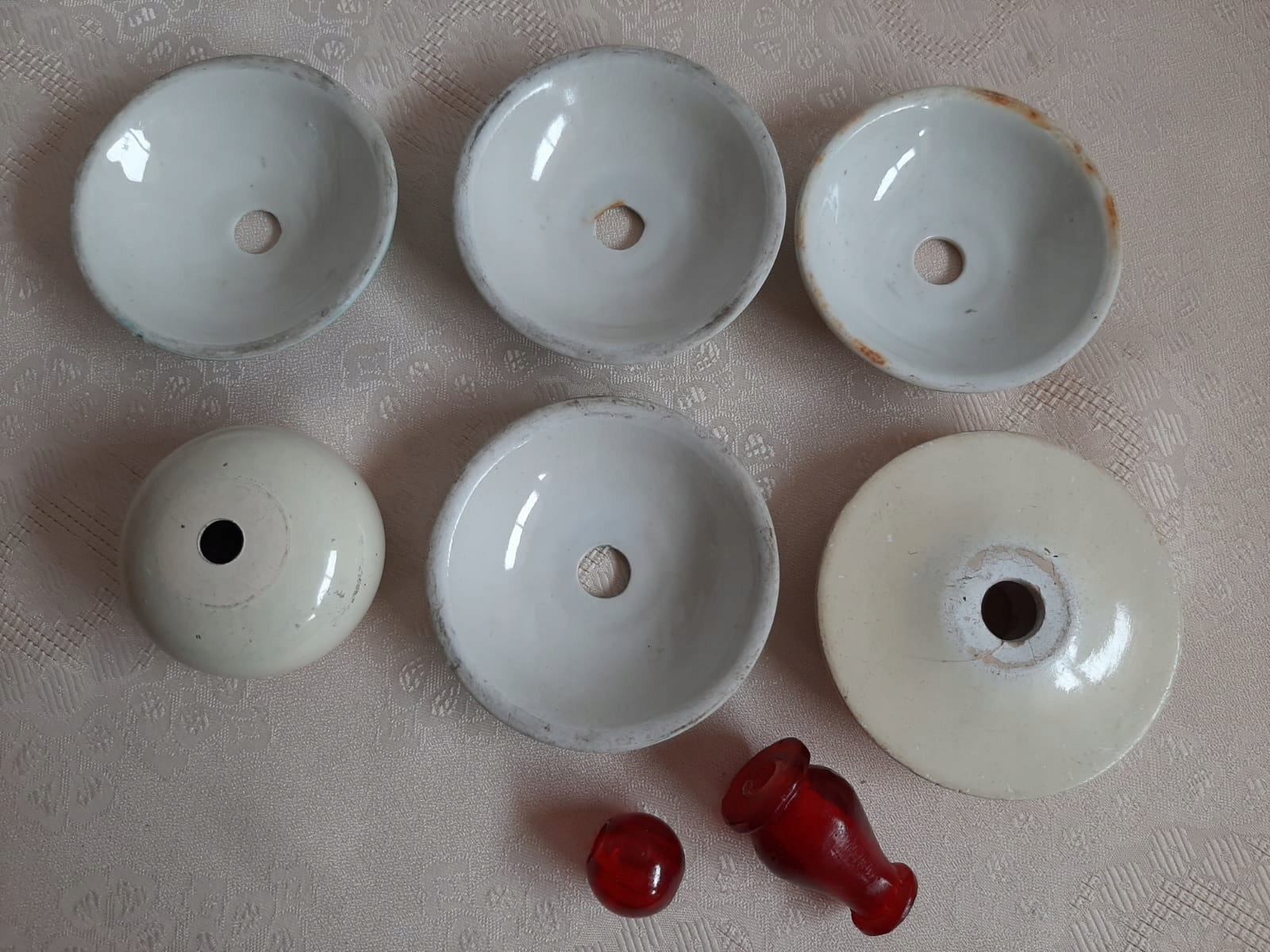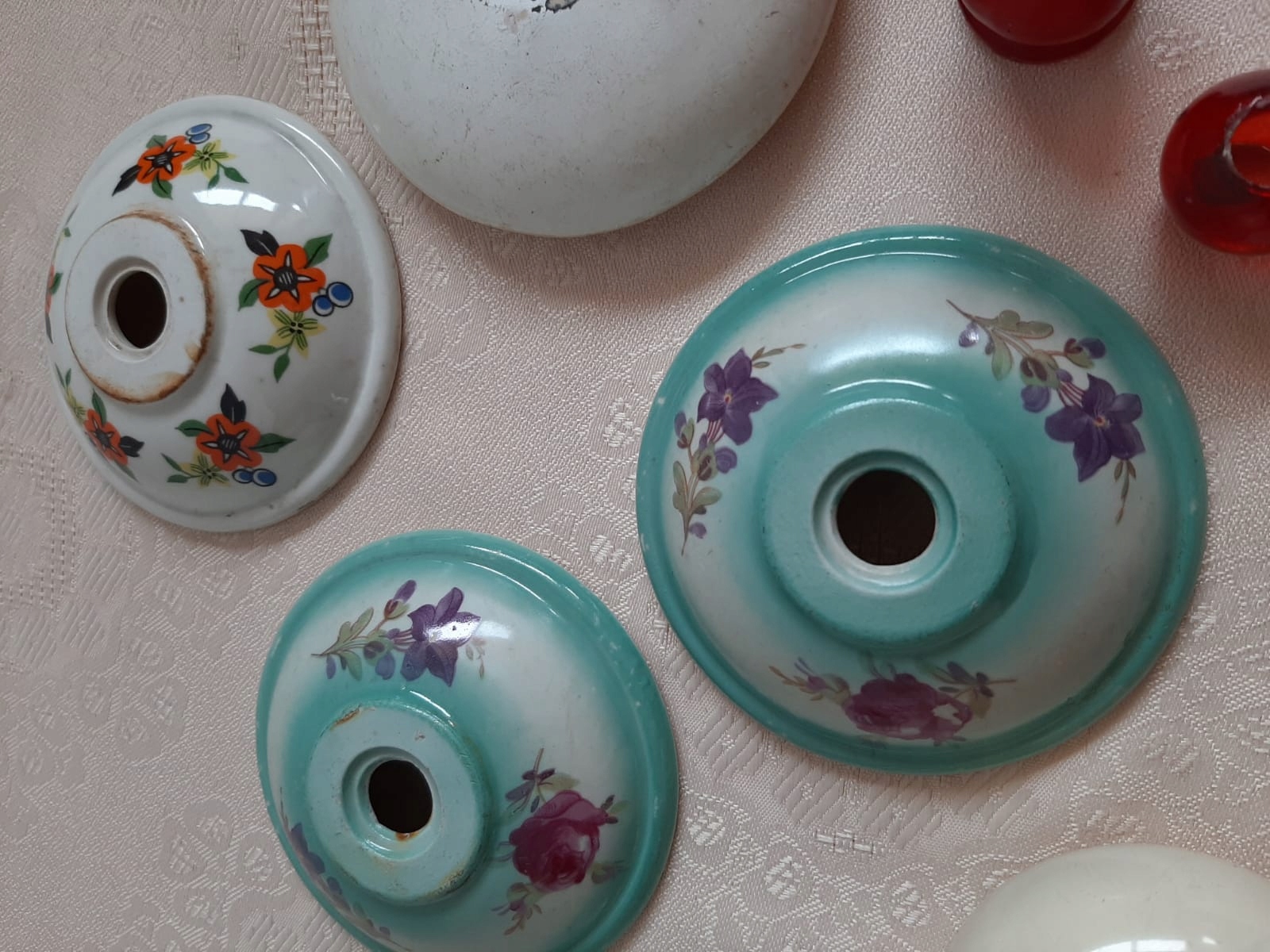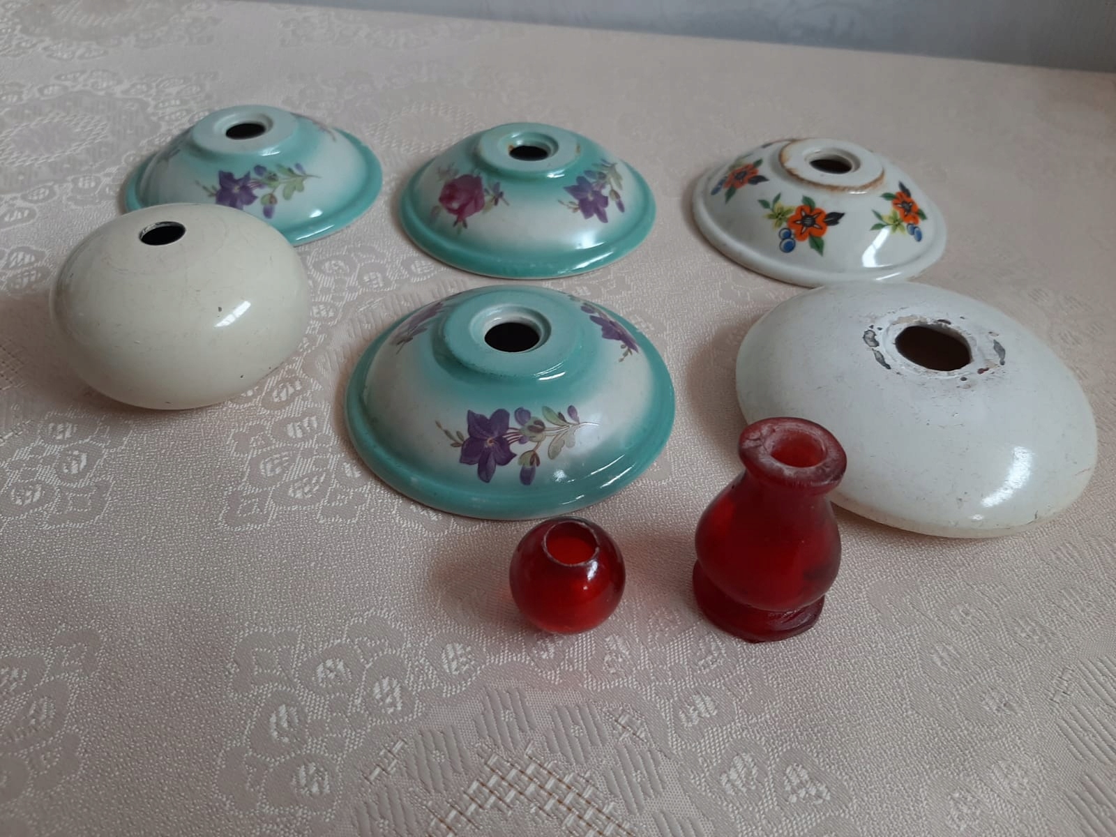 Przedmiotem aukcji są bardzo stare porcelanowe, ceramiczne elementy do lamp widoczne na zdjęciach. Średnica 3 szt turkusowych - 9 cm. Średnica 1 szt białej w kwiaty - 9 cm. Średnica 1 szt białej bez wzoru, większej - 9,5 cm. Średnica 1 szt bez wzoru mniejszej - 6,5 cm.Stan jak na zdjęciach.