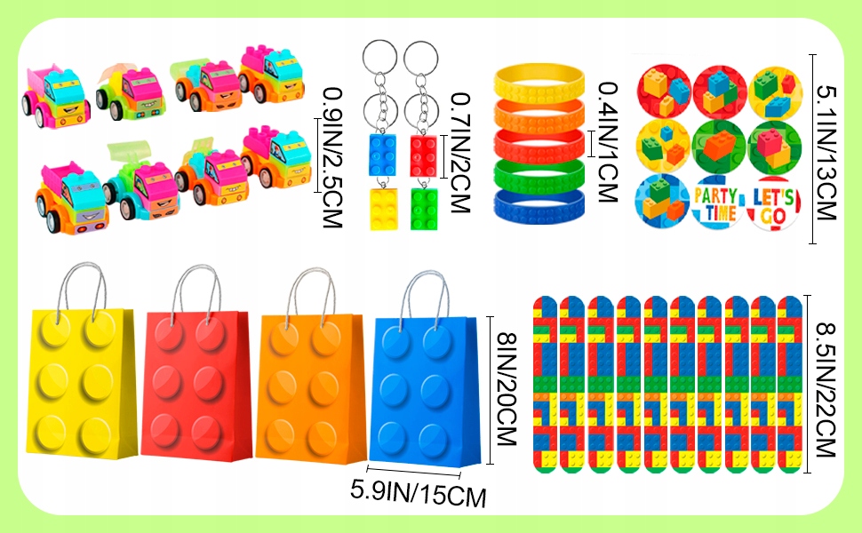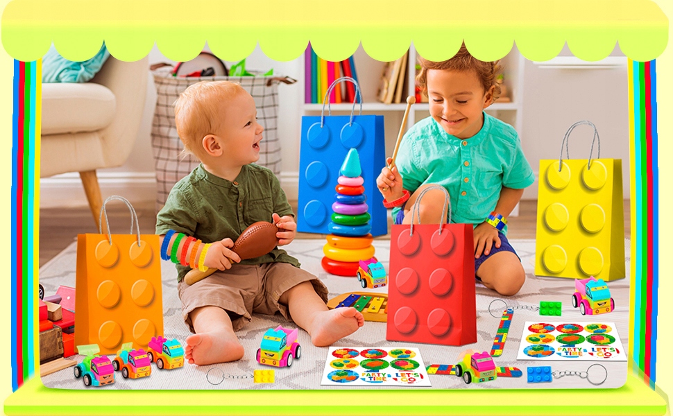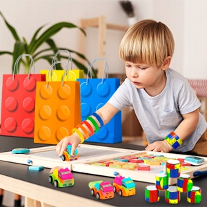 Klocki konstrukcyjne traktują torby zawarte w przysługach na imprezę z klocków konstrukcyjnych są w 4 klasycznych kwadratowych kolorach klocków, czerwonym, żółtym, pomarańczowym i niebieskim, dzięki czemu dzieci mogą wybrać swoje ulubione klocki konstrukcyjne torby na gadżety do użycia.