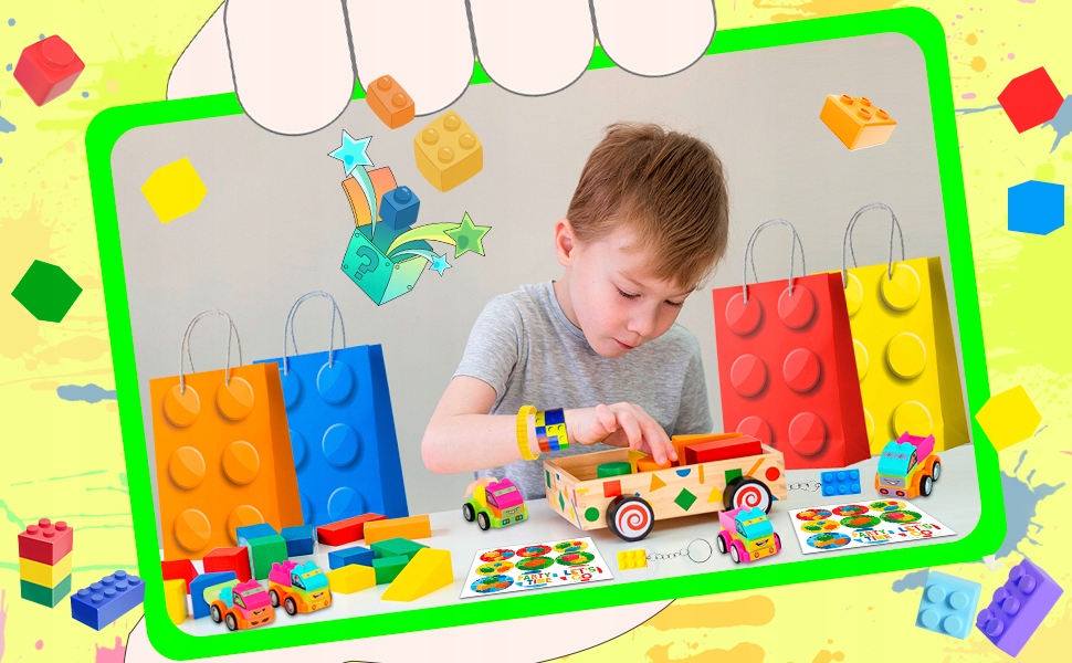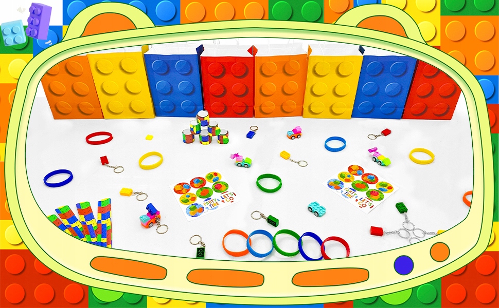 Jest to bogaty i kolorowy zestaw przysług na przyjęcie urodzinowe z motywem klocków konstrukcyjnych, które każdy miłośnik klocków zakocha się w tych przysługach na imprezę z klocków od pierwszego wejrzenia! Więc nasze przysługi na imprezę z klocków budowlanych z pewnością będą hitem na twojej imprezie z klockami budowlanymi.