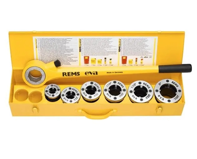 Gwintownica ręczna REMS EVA Set w skrzynce z blachy z szybkowymiennymi głowicami do gwintów rurowych 1/2"-2"