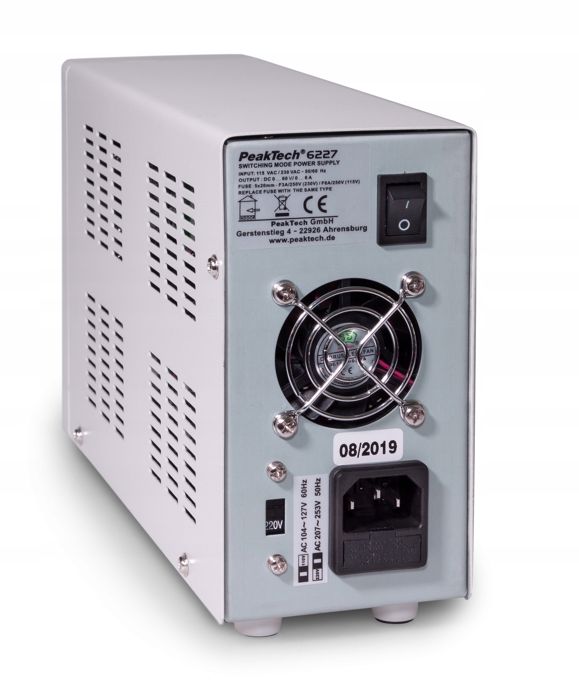 nazwa typu elementu: PeakTech 6227 – DC zasilacz laboratoryjny 0-60 V / 0-6 A z kolorowym wyświetlaczem LCD, zasilacz laboratoryjny z 2 portami USB, regulowane napięcie wyjściowe, napięcie robocze 115-240 V AC/ 50-60 Hz – EN 61010-1