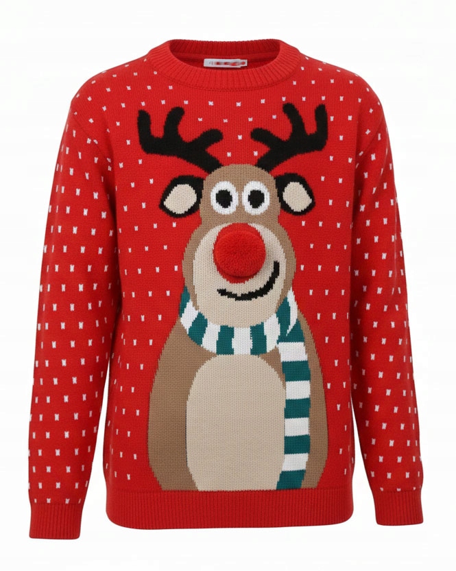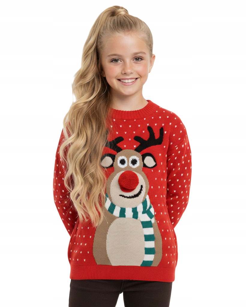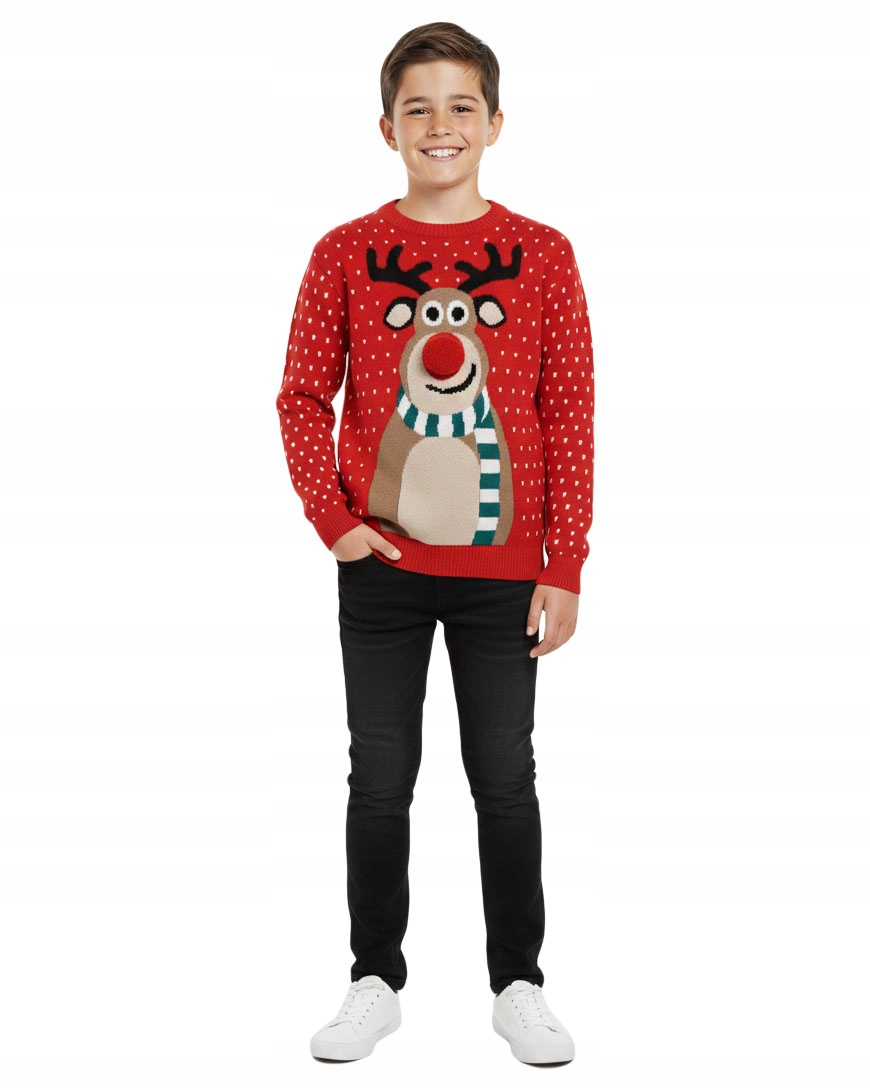 Wyjątkowy czerwony dziecięcy sweter świąteczny z uroczym reniferem to idealny wybór na zimowe dni, rodzinne spotkania i szkolne przedstawienia. Charakteru dodaje nos 3D w formie miękkiego pompona, który wywoła uśmiech na twarzy każdego dziecka.