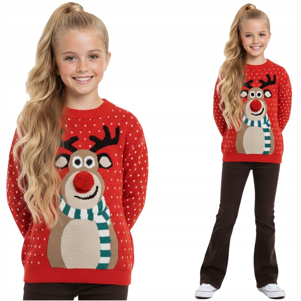 SWETER ŚWIĄTECZNY DZIECIĘCY CZERWONY RENIFER 3D POMPON PREZENT CIEPŁY