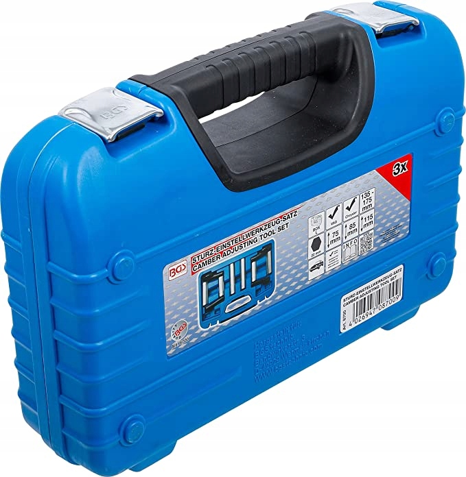 punkt znaku wypunktowania: umożliwia regulację pochylenia kół przez jedną osobę, skraca czas pracy, rozpiętość 135 - 175 mm, śruba z łbem sześciokątnym 22 mm, 3 długości śruby dla szerokiego zakresu zastosowań:75 mm do marek Seat Toledo VW Jetta, Golf itd., 85 mm do modeli Seat Cordoba VW Polo od roku prod. 1995, 115 mm np. do modelu Chrysler Voyager itp.