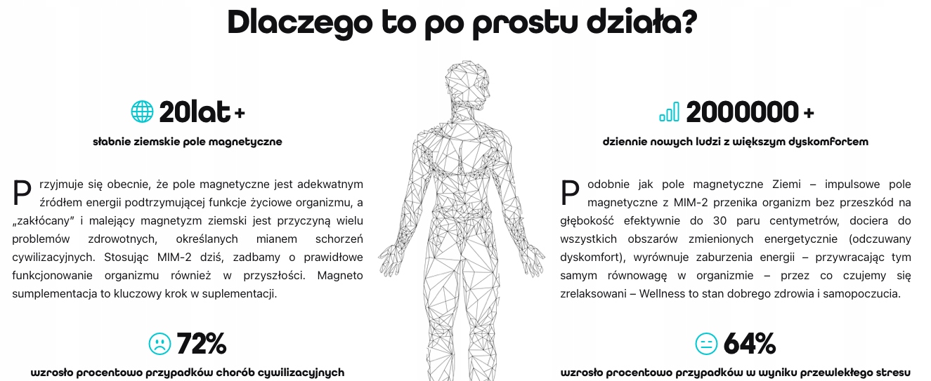P: Jak długo stosować? O: Minimum 30 minut dziennie. Można stosować dowolnie długo - pole < 5μT jest bezpieczne. MIM-2 generuje idealne / optymalne tło magnetyczne dla biologicznego życia.