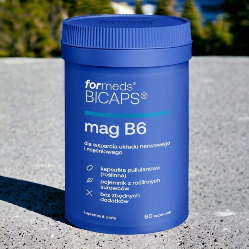 BICAPS MAG B6 zawiera 187,5 mg magnezu (w wysoko przyswajalnej formie cytrynianu magnezu) oraz witaminę B6. Czysty skład - produkt nie zawiera m.in. sztucznych wypełniaczy, przeciwzbrylaczy i barwników. Naturalna, wegańska kapsułka z pullulanu - pozyskiwanego w procesie fermentacji. Pojemnik wytworzony z użyciem roślinnych surowców. Produkt odpowiedni dla wegetarian i wegan.
