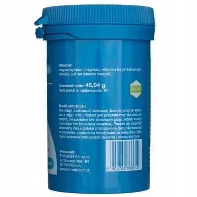 Skład: magnez (cytrynian magnezu), witamina B6 (5'-fosforan pirydoksalu), pullulan (otoczka kapsułki)
