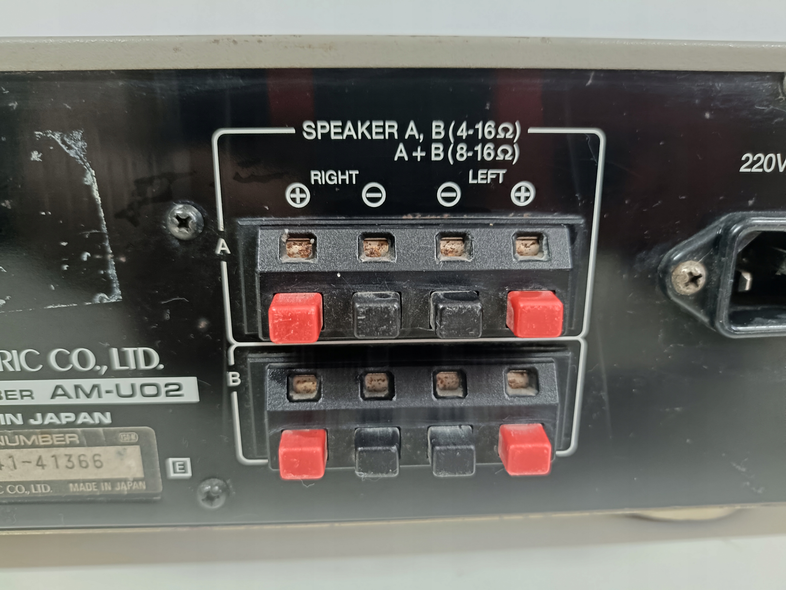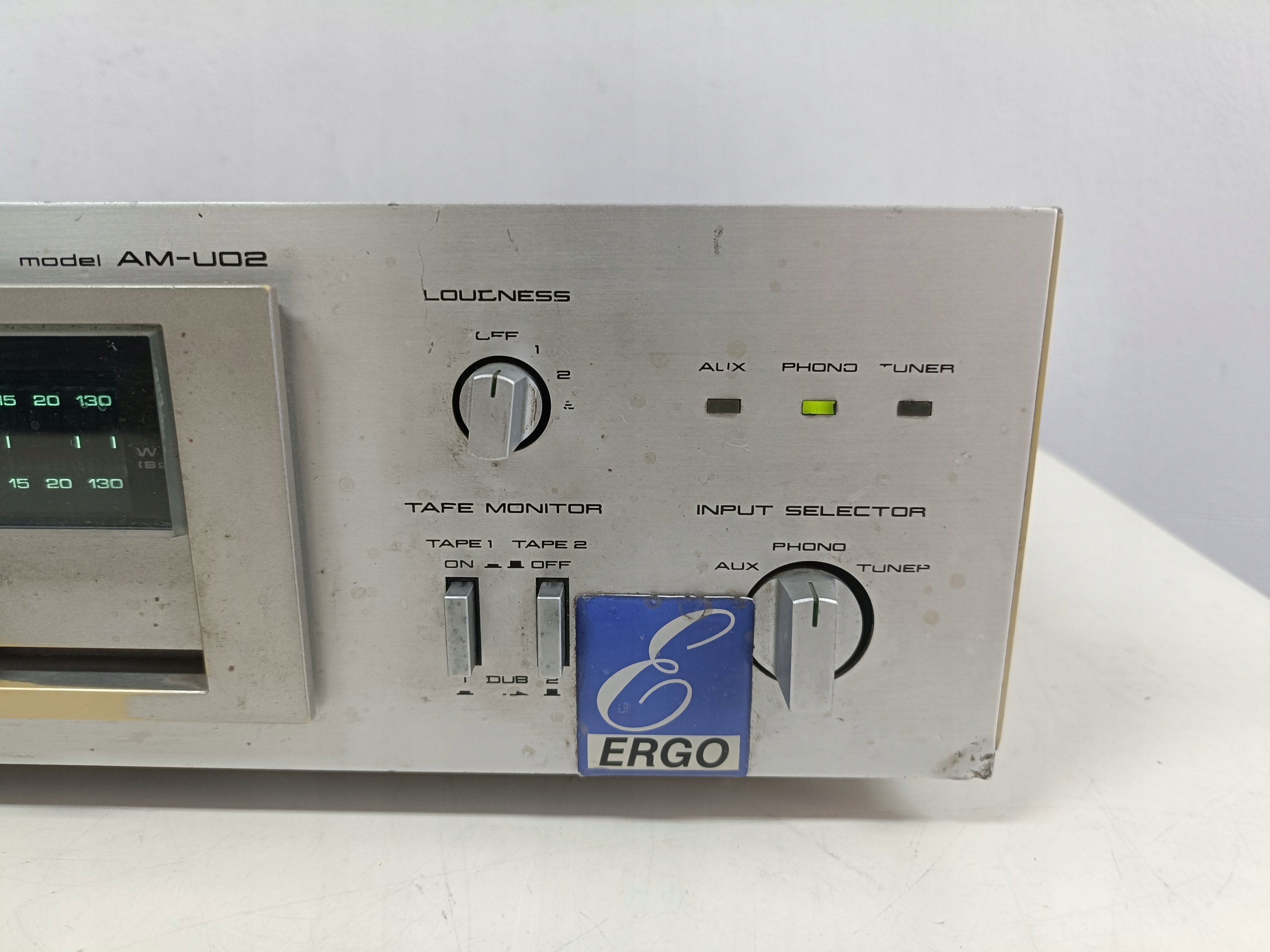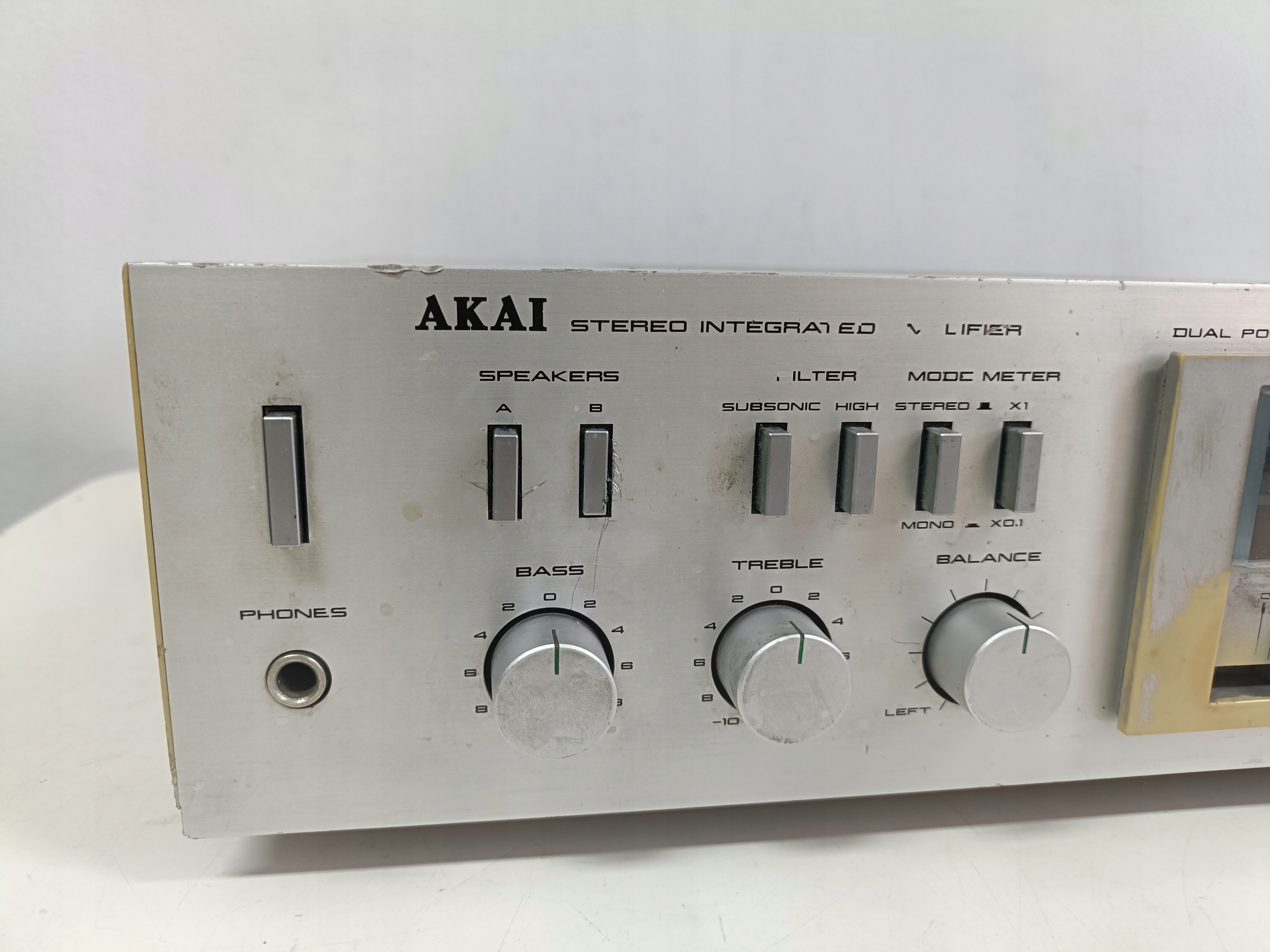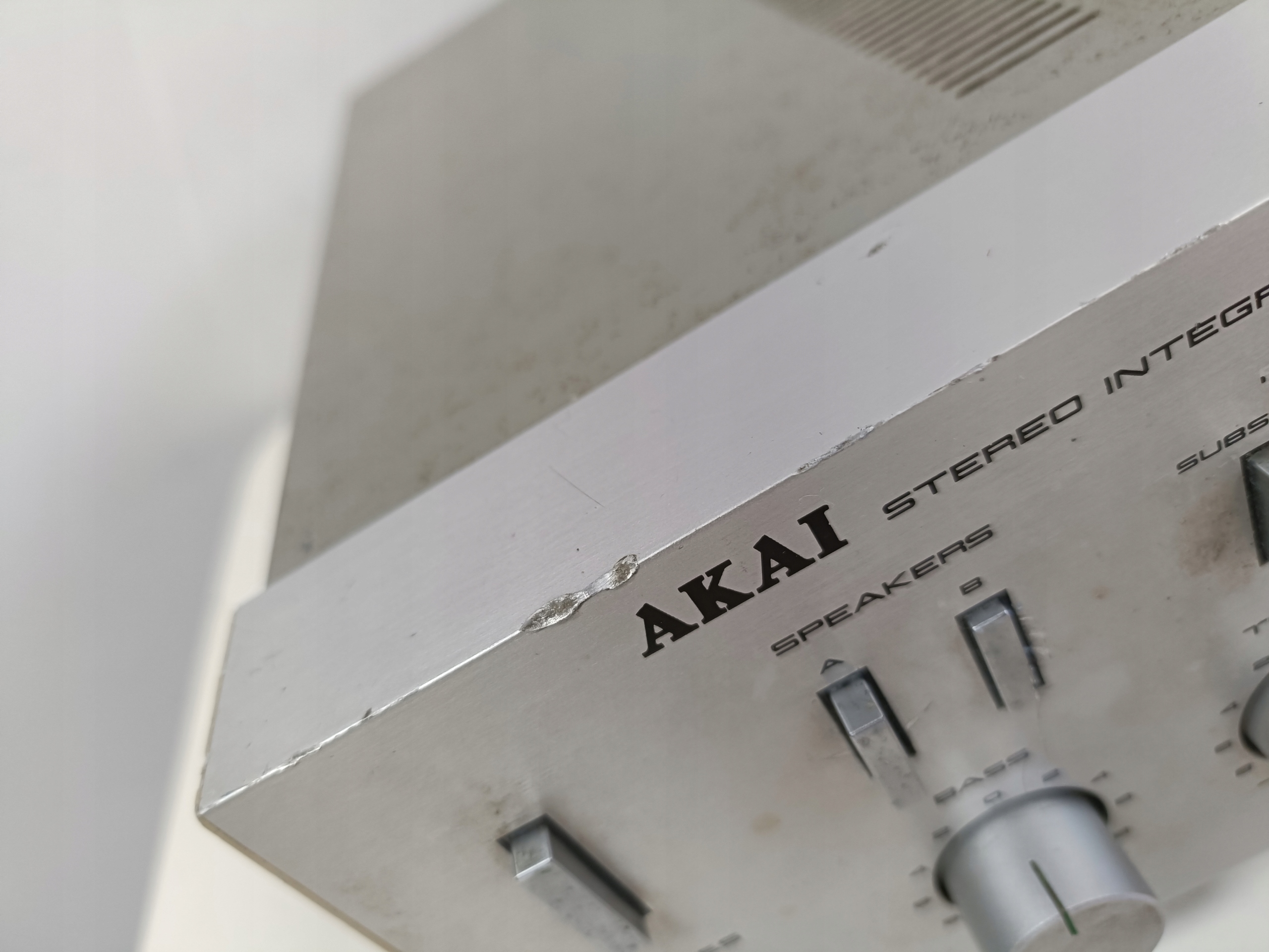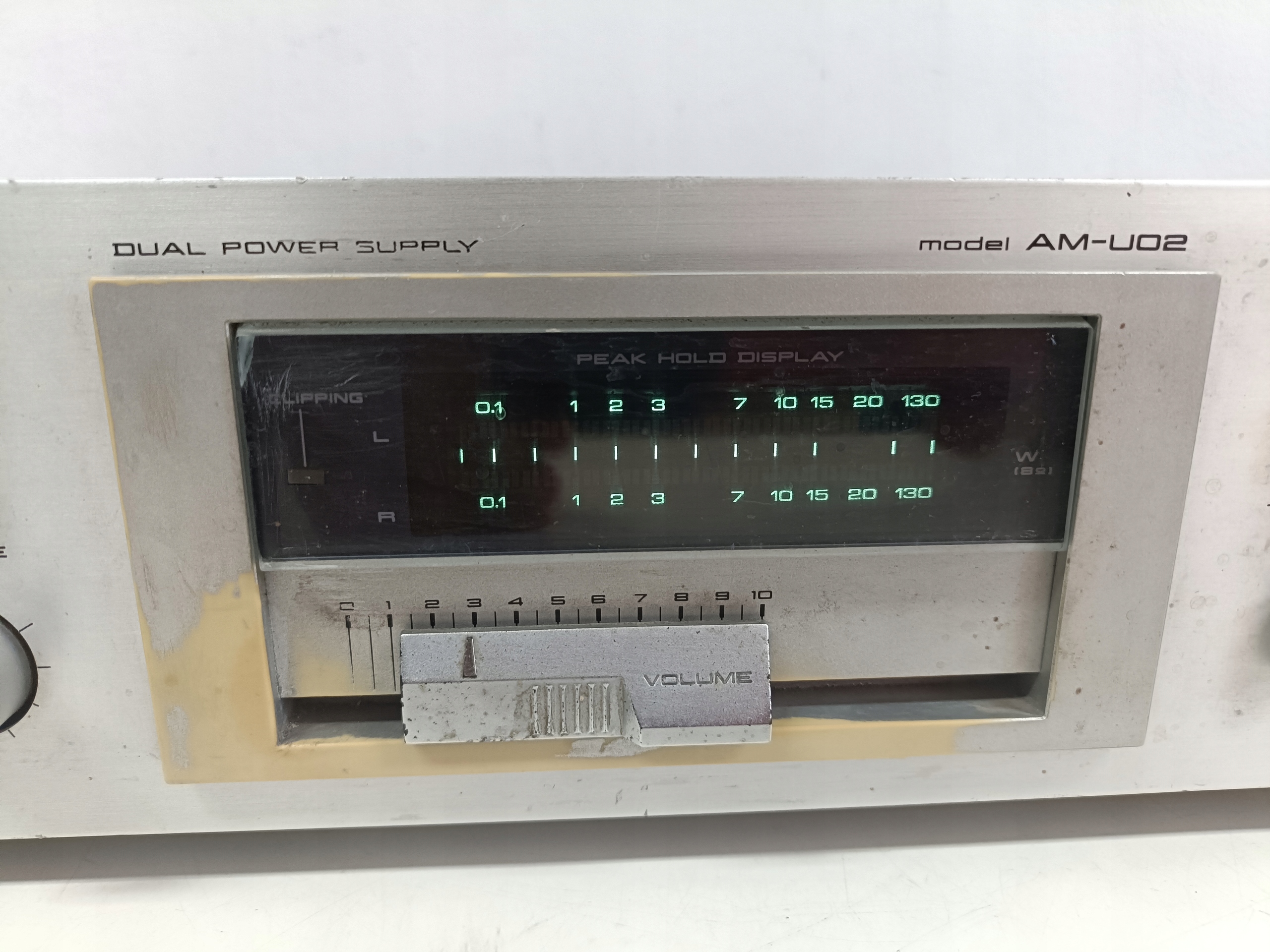 Wzmacniacz audio z początku lat 80-tych : AKAI AM-U02 ( Wduszony przycisk SPEAKERS B , Speakers A odskakuje , brak dzwięku ! , bez jednej nóżki i bez kabla zasilającego ! ) .