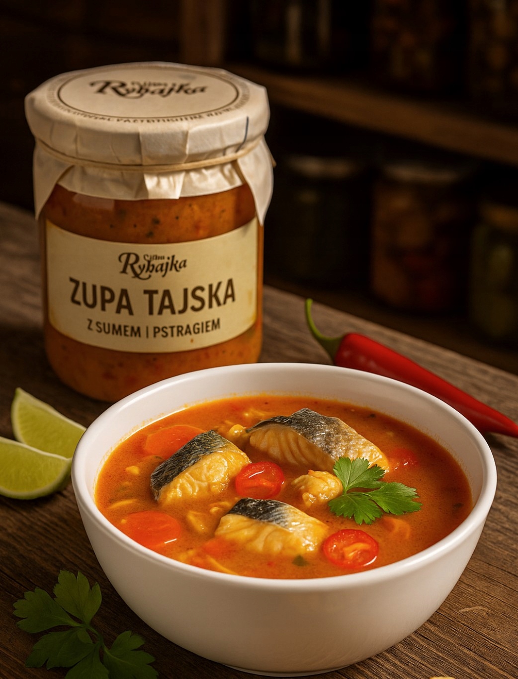Orientalna zupa o głębokim, wyrazistym smaku. Soczyste kawałki suma i delikatny pstrąg zanurzone są w aksamitnym mleczku kokosowym, doprawionym aromatyczną pastą curry, która nadaje całości charakterystycznej ostro-słodkiej nuty. Papryka i świeże warzywa dodają naturalnej słodyczy, lekkości i koloru, tworząc idealną harmonię z kremową bazą.