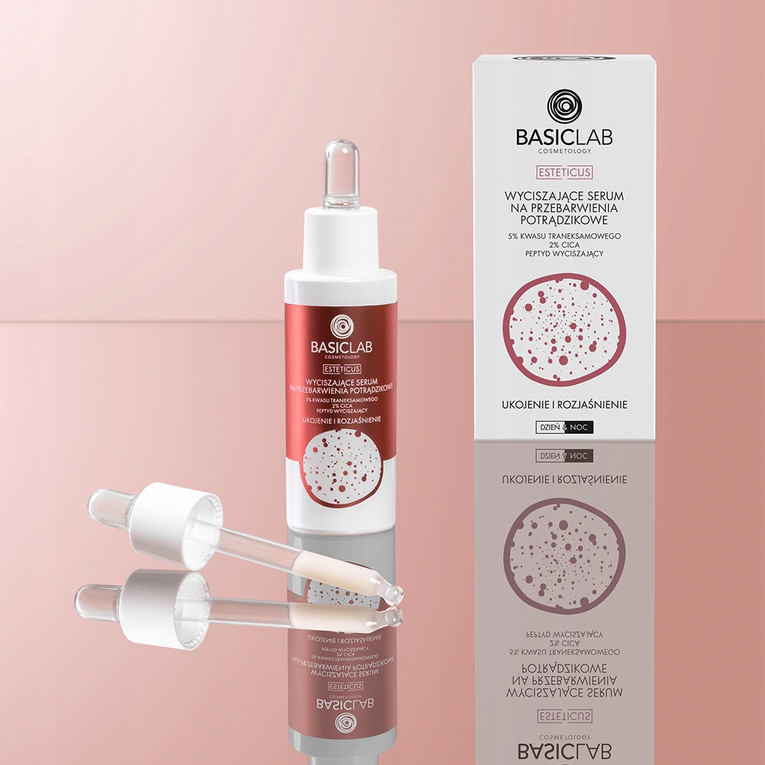 Wyciszające serum na przebarwienia potrądzikowe marki BasicLab to zaawansowana formuła stworzona z myślą o skórze zmagającej się z zaczerwienieniami i śladami po stanach mikrozapalnych. Dzięki zawartości 5% kwasu traneksamowego, 2% CICA oraz peptydu wyciszającego, serum skutecznie redukuje przebarwienia, wyrównuje koloryt skóry i wspiera jej regenerację. Produkt jest wegański, nie zawiera substancji zapachowych i został przetestowany dermatologicznie, co czyni go idealnym wyborem nawet dla skóry wrażliwej.