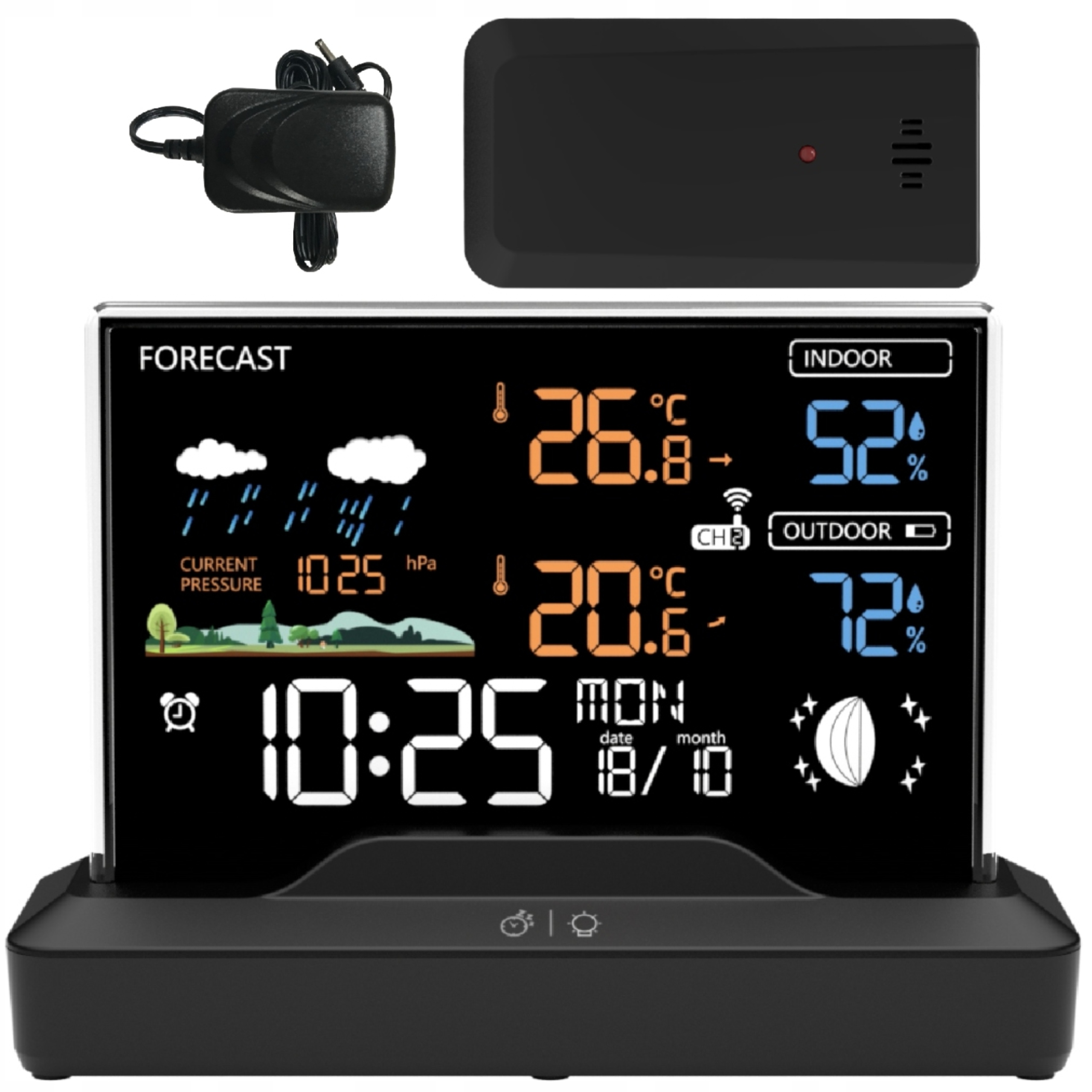 ➡️ Stacja działa zarówno na zasilaniu sieciowym 5V, jak i na bateriach (2x AAA) do podtrzymania ustawień. Dzięki temu możesz korzystać z niej w dowolnym miejscu.
