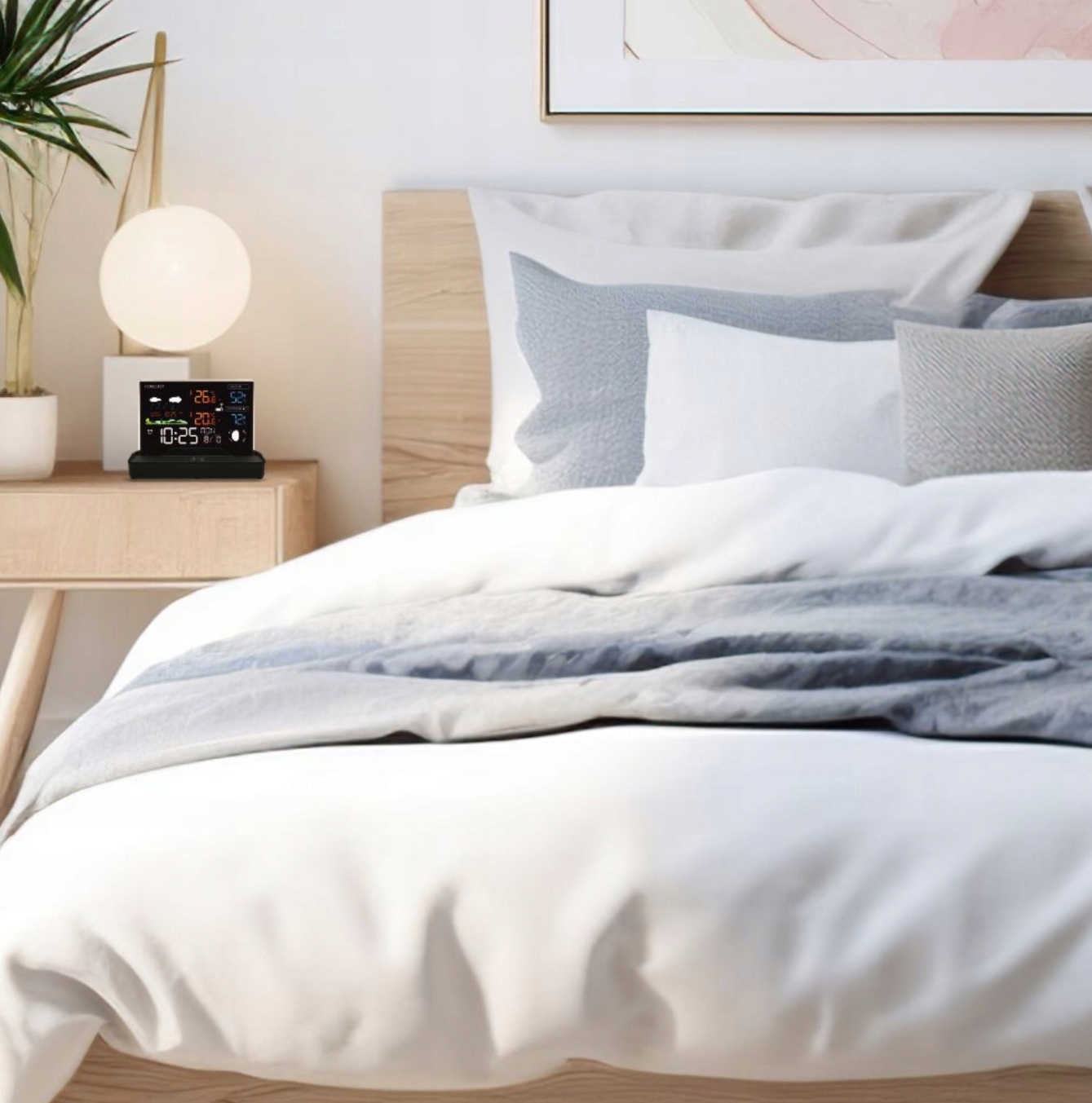 ➡️ Budzik z funkcją drzemki, pamięć pomiarów maksymalnych i minimalnych do 24h, alarmy temperatury oraz możliwość używania stacji jako lampki nocnej dzięki podświetleniu.