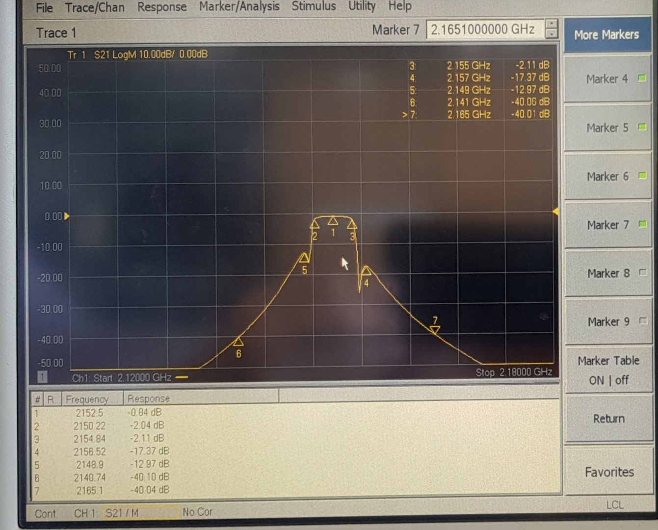 W środku pasma przepustowego ma pomijalnie małe tłumienie wynoszące ok. 0,4dB a dla częstotliwości oddalonej o jedynie 12MHz od częstotliwości środkowej która w wypadku tego filtra wynosi 2,152GHz tłumienie wynosi 40dB.