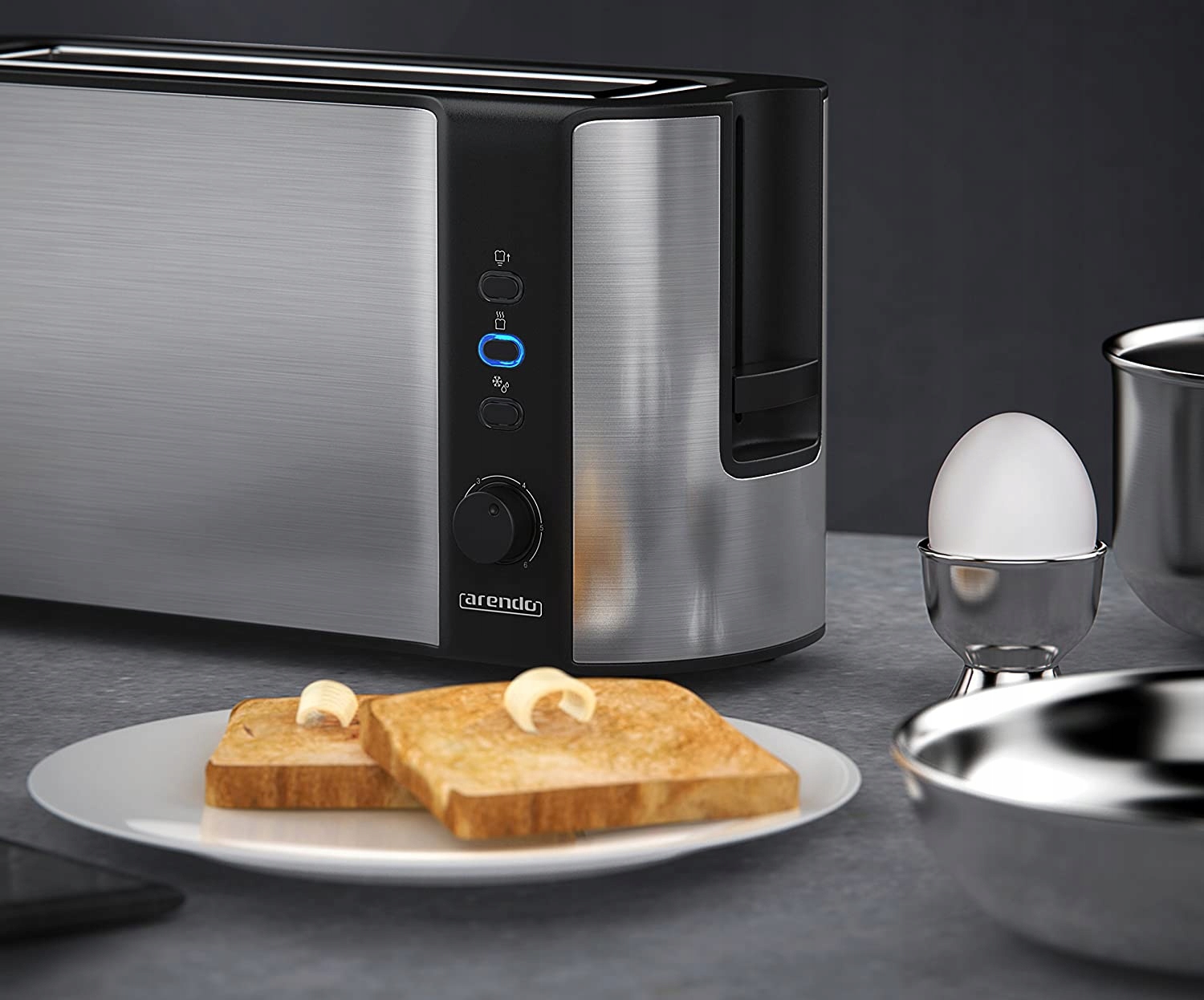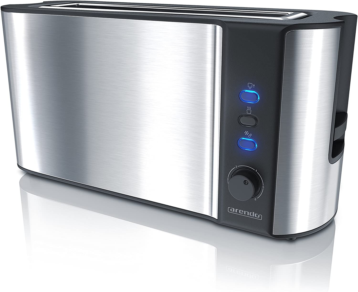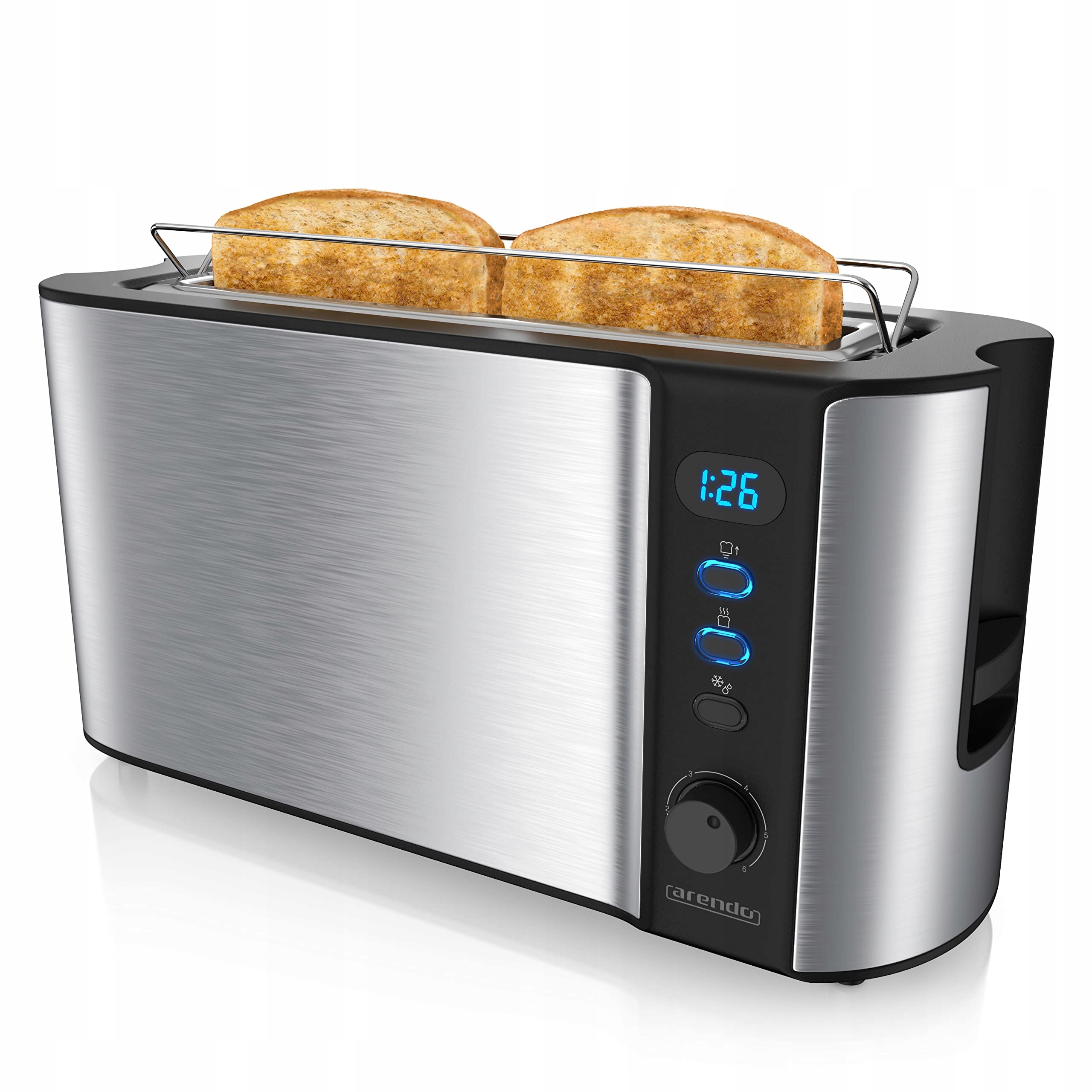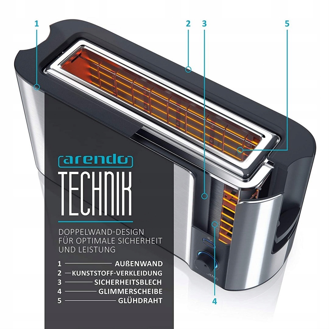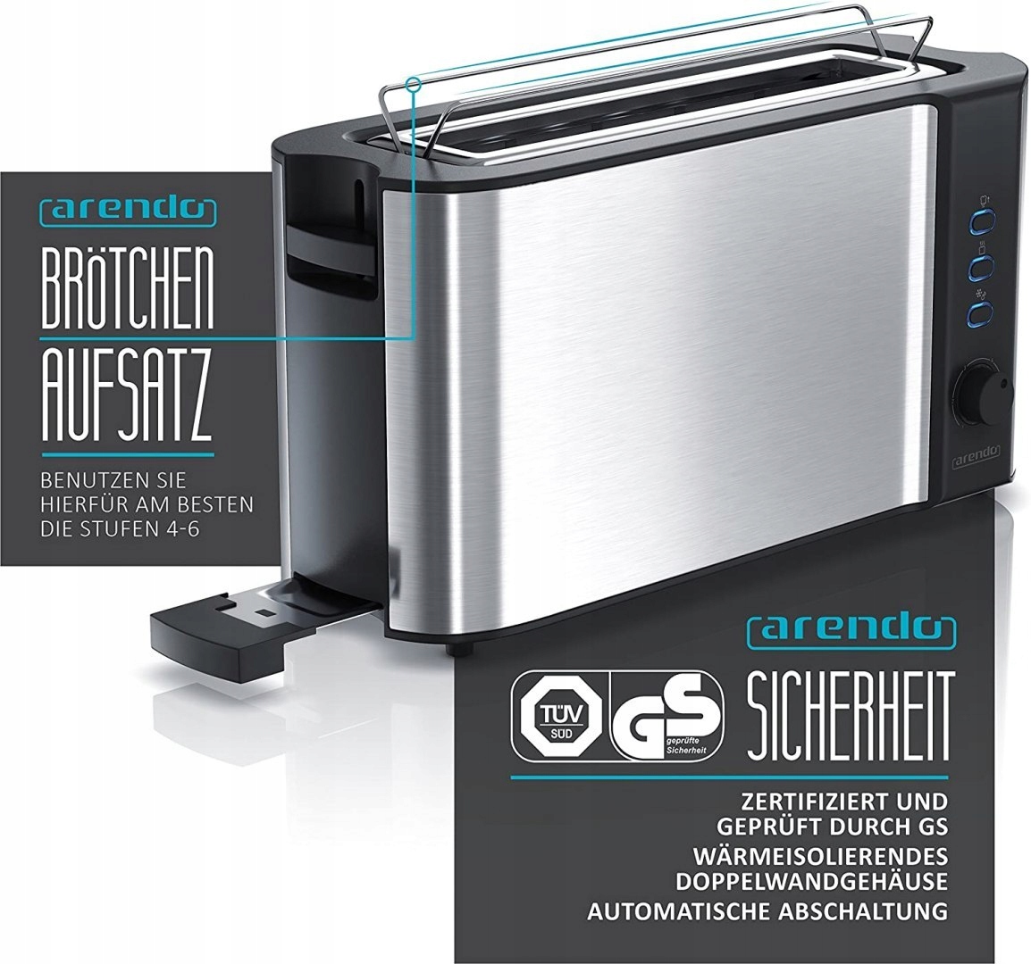 Automatyczny toster Arendo model B07BHLCX95 to praktyczne urządzenie kuchenne przeznaczone do przygotowywania chrupiących tostów. Dzięki długiemu otworowi możliwe jest opiekanie kromek chleba i bułek o różnej wielkości. Obudowa tostera została wykonana ze stali nierdzewnej oraz posiada podwójne ścianki zapewniające izolację ciepła. Toster wyposażony jest w bezstopniowy regulator pozwalający dobrać stopień przyrumienienia, aż do sześciu poziomów. Funkcja automatycznego centrowania kromek sprawia, że pieczywo jest równomiernie opiekane z obu stron. Urządzenie posiada również funkcję rozmrażania, sygnalizowaną przez niebieską diodę LED, oraz automatyczne wyłączanie zapewniające bezpieczeństwo użytkowania.