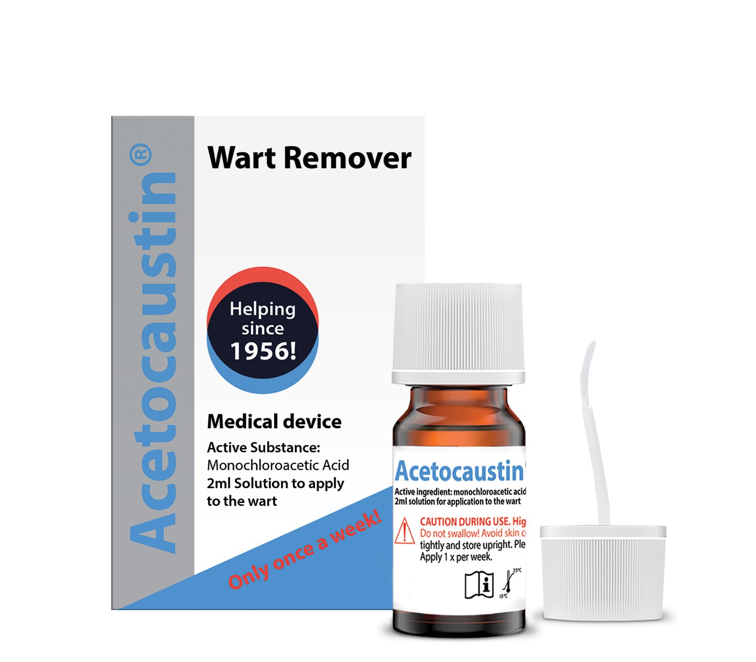 Acetocaustin dzięki zawartości w składzie kwasu monochlorooctowego niszczy zakażone komórki skóry i usuwa warstwę rogową naskórka, w której osadzony jest wirus brodawczaka ludzkiego (HPV). Działa szybko i miejscowo, eliminując brodawkę bez konieczności zabiegów chirurgicznych.