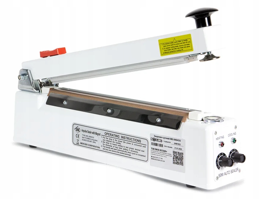 Elektryczna zgrzewarka worków ME-305НCG - ręczna stacjonarna zgrzewarka folii polimerowych z przycinaniem mechanicznym i magnesem. Zgrzewarka przeznaczona jest do zgrzewania opakowań i worków (formowania szwu) z różnych folii - polietylenowych, polipropylenowych, a także papierów laminowanych w procesie produkcji różnorodnych wyrobów z materiałów zgrzewalnych do pakowania towarów.