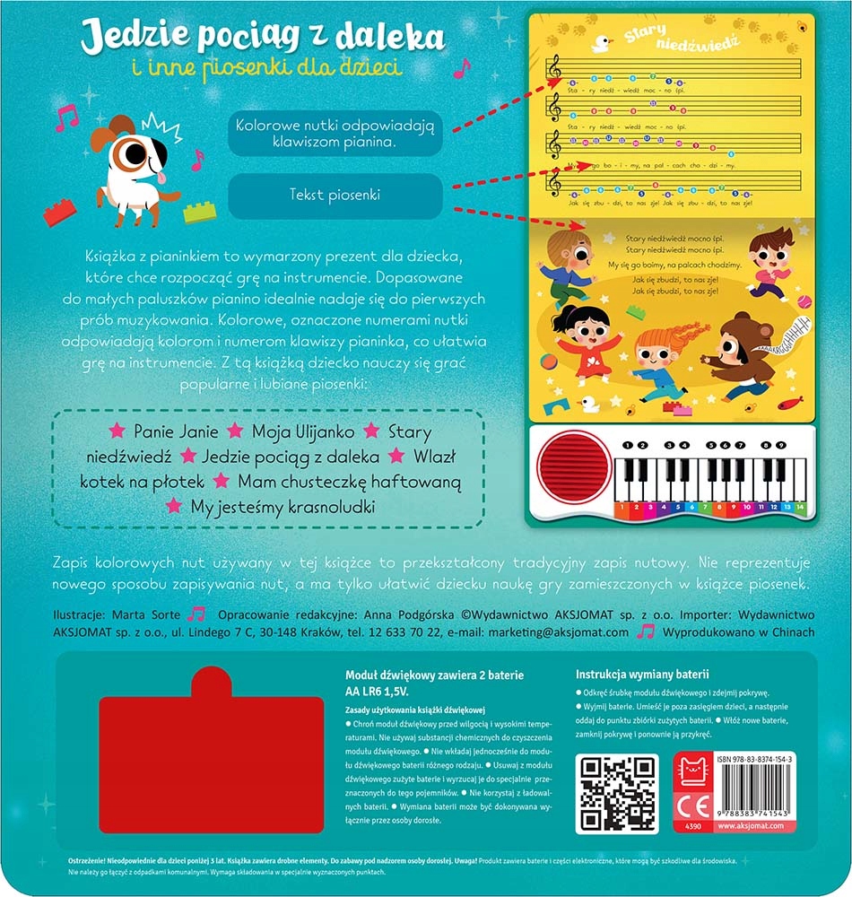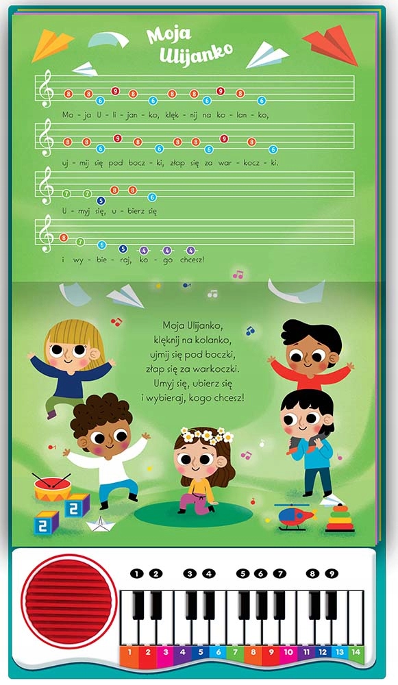 Siedem popularnych, znanych od pokoleń i ciągle lubianych polskich piosenek oraz siedem uproszczonych zapisów nutowych i pianinko, na którym dziecko może zagrać wszystkie zamieszczone w książce utwory. Ta książka to nie tylko hołd w stronę śpiewania tradycyjnych utworów, ale i sposób na zachęcenie dziecka do nauki gry na instrumencie.