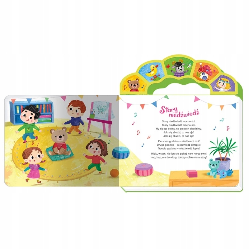 Oddajemy do Państwa rąk zbiór z pięknie zaśpiewnymi piosenkami dla dzieci, lubianymi i znanymi od pokoleń. Format książki jest bardzo poręczny dla malucha - idealnie dopasowuje się do małych rączek. Kolorowe ilustracje oraz teksty każdej z piosenek zachęcą dziecko do wspólnego śpiewania. Teksty otoczone są kolorowymi ilustracjami, nawiązującymi do treści piosenek, często je uzupełniają, a co najważniejsze - zachęcają do wspólnej zabawy. Piosenkę można włączyć, naciskając obrazek na rączce - jeden obrazek odpowiada jednej piosence. W każdej chwili można wyłączyć grającą melodię, ponownie naciskając obrazek. Książka działa na baterie, które można wyjąć i wymienić. Istnieje również możliwość wyłączenia grających piosenek, przesuwając guzik przy baterii. Książka sprawdzi się dla dzieci w każdym wieku. Młodsze mogą tylko słuchać piosenek, starsze dzieci mogą przeczytać tekst i śpiewać równocześnie z nagraniem. W zbiorze znajduje się pięć popularnych piosenek wraz z nagraniami: Stary niedźwiedź, Koła autobusu, O czarnym baranie, My jesteśmy krasnoludki, Dorotka. Piosenki, które znają wszyscy, nagrania, które nigdy nie ulecą z pamięci. Książeczki z nagraniami - doskonałe do słuchania i śpiewania!