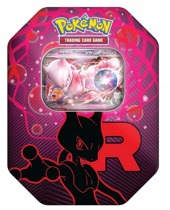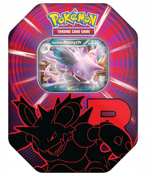 ✅ Puszka kolekcjonerska Team Rocket ( logo „R”) – solidne metalowe opakowanie, idealne do przechowywania kart i ozdoba każdej półki fana Pokémon.