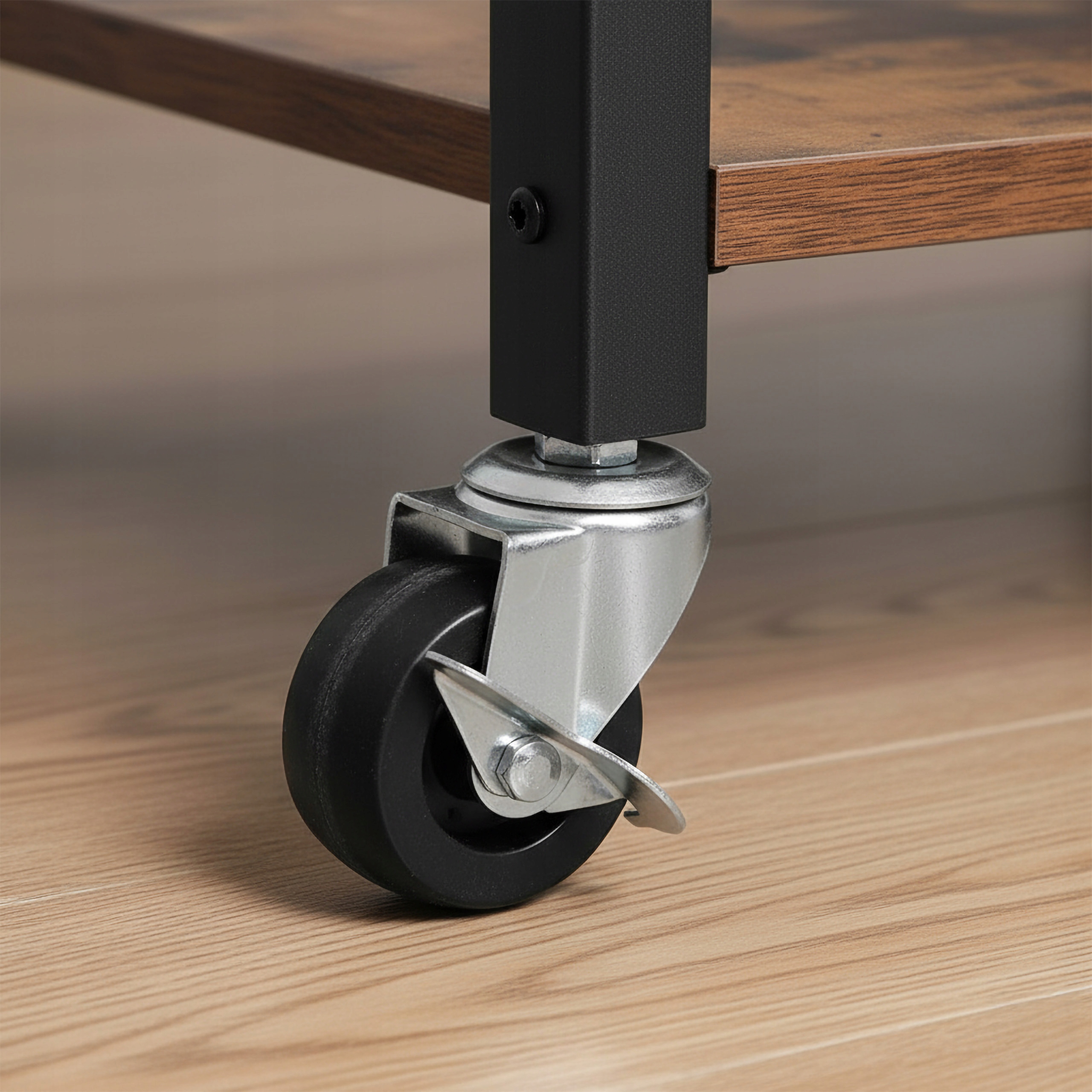 Regał jest osadzony na 4 wygodnych kółkach z możliwością obrotu o 360 stopni, dwa z nich są wyposażone w hamulec.