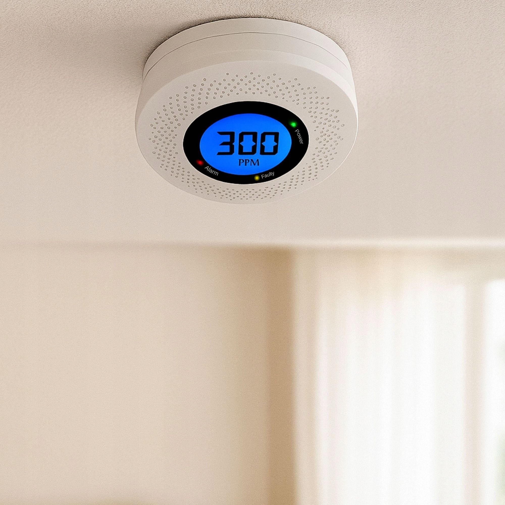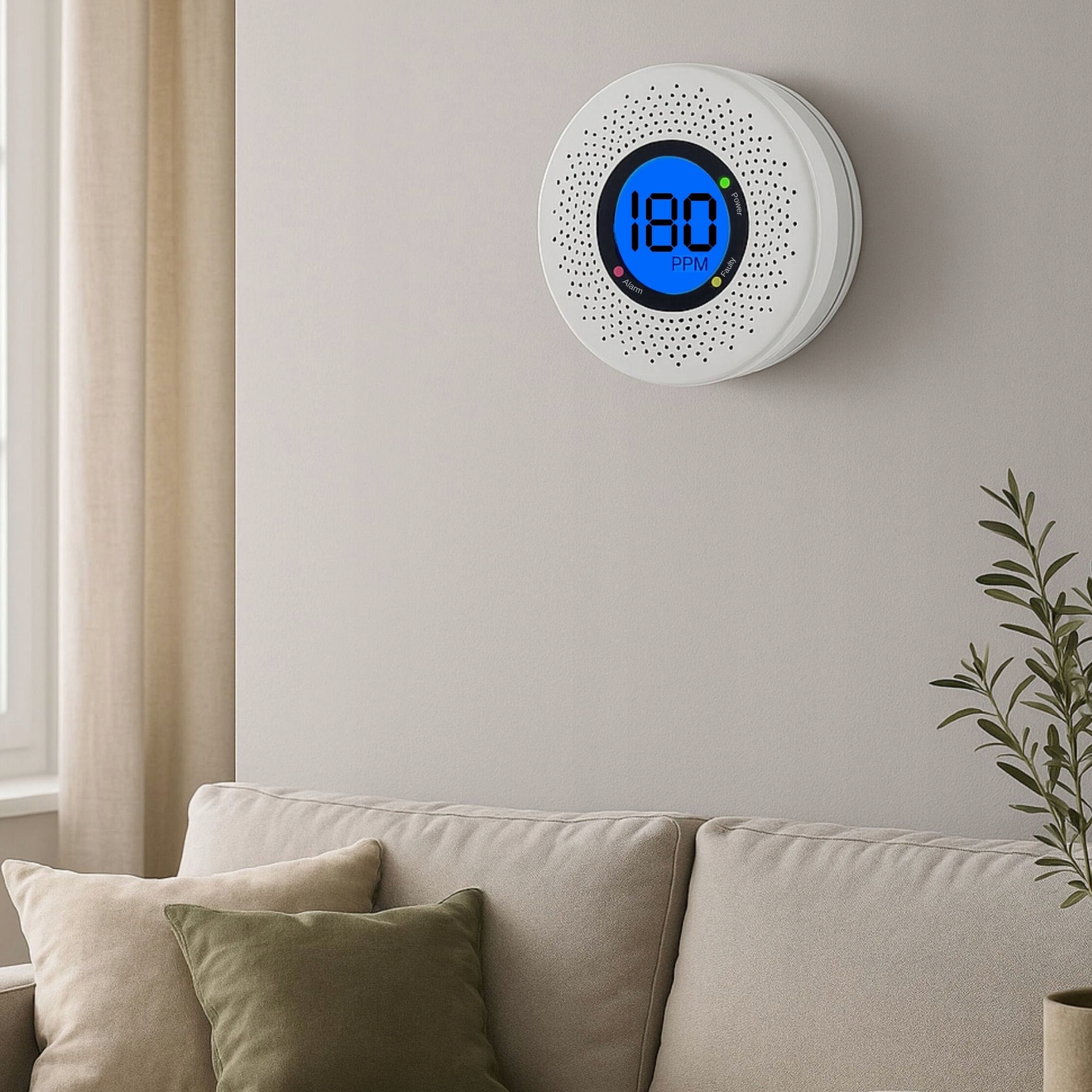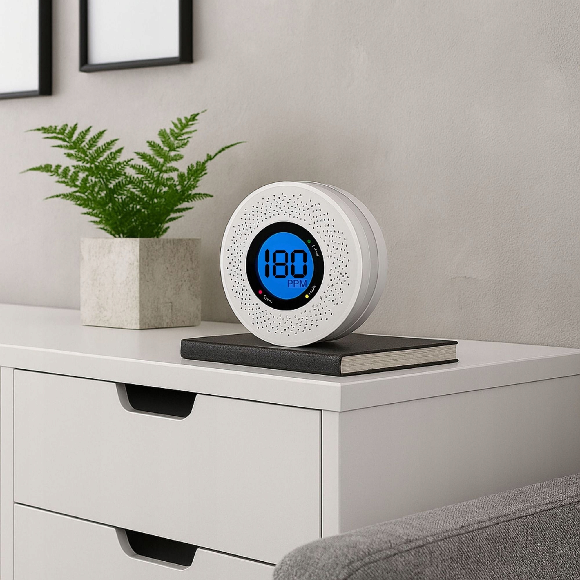 Ten czujnik tlenku węgla łączy w sobie funkcję alarmu ostrzegawczego oraz precyzyjny wyświetlacz LCD do stałego monitorowania jakości powietrza 2w1.