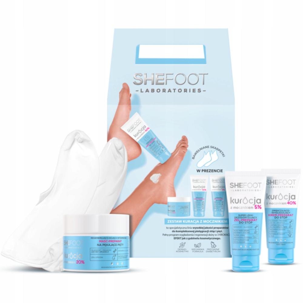 Zestaw SHEFOOT Kuracja Z Mocznikiem to zaawansowany zestaw do intensywnej regeneracji stóp i pięt, wzbogacony o bawełniane skarpetki. Dzięki wysokiej zawartości mocznika i starannie dobranym składnikom aktywnym preparaty działają synergicznie, zapewniając natychmiastowe wygładzenie, nawilżenie i ukojenie. Skóra stóp staje się miękka, zregenerowana i odzyskuje komfort już po pierwszym użyciu. W skład zestawu wchodzą trzy preparaty o różnych stężeniach mocznika oraz bawełniane skarpetki. To idealne rozwiązanie dla osób pragnących kompleksowej pielęgnacji stóp.
