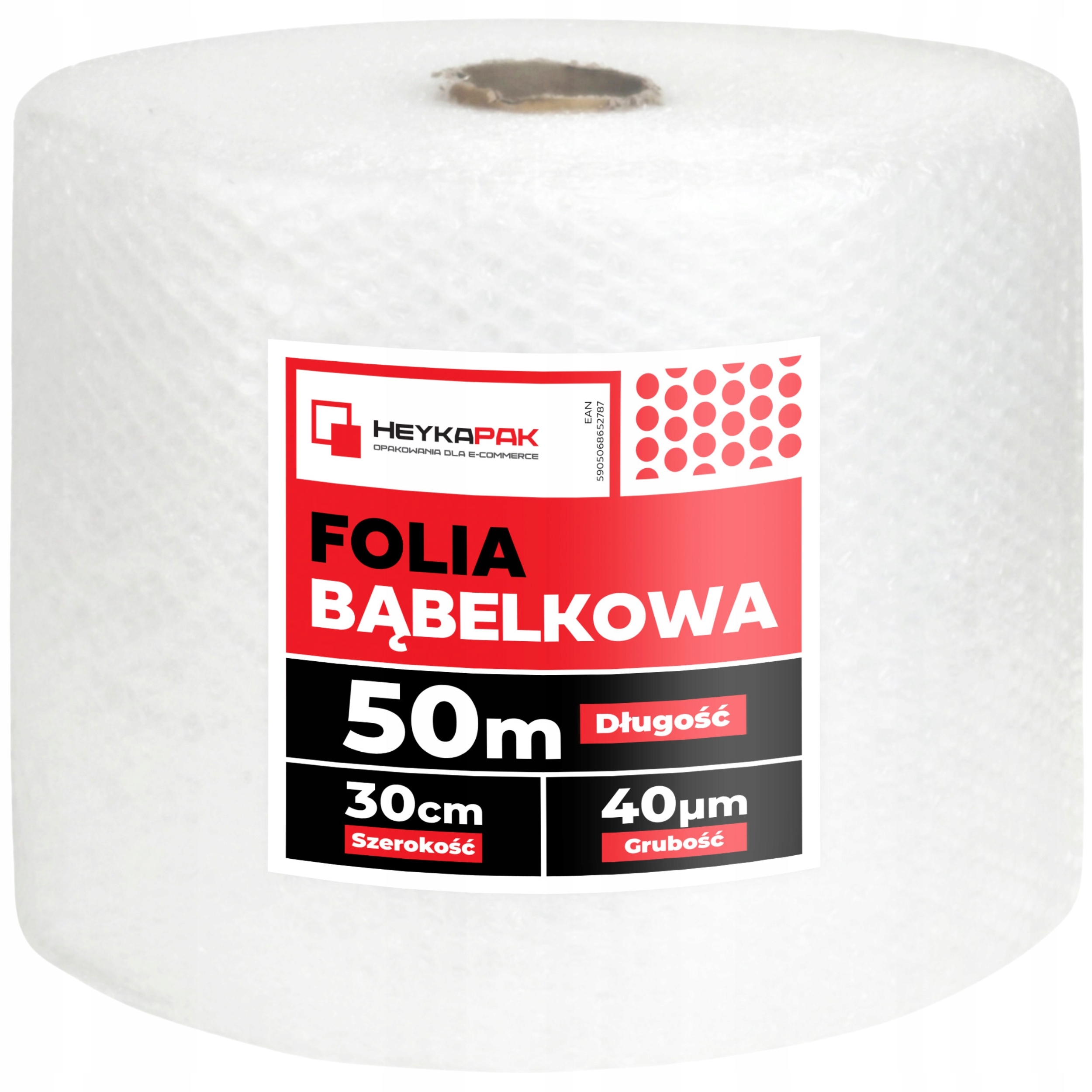 Szerokość: 30 cm | Długość: 50 mb | Grubość folii: 40 μm | Średnica rolki: ok. 38 cm | Średnica pęcherzyków: 10 mm | Masa jednej rolki: ok. 0,65 kg