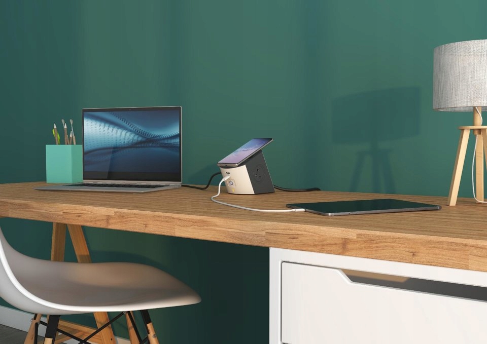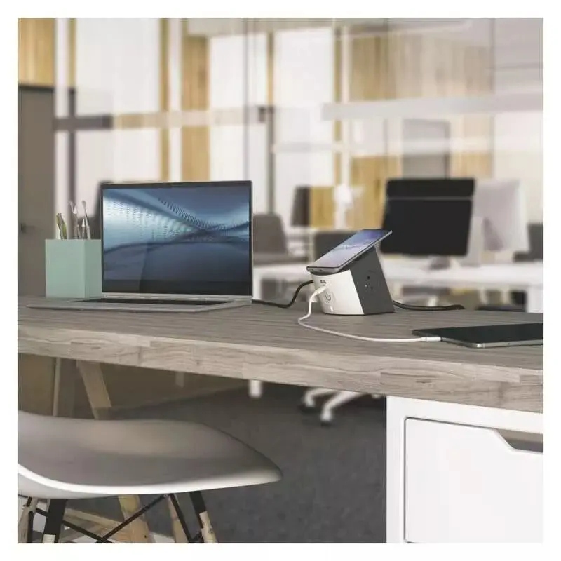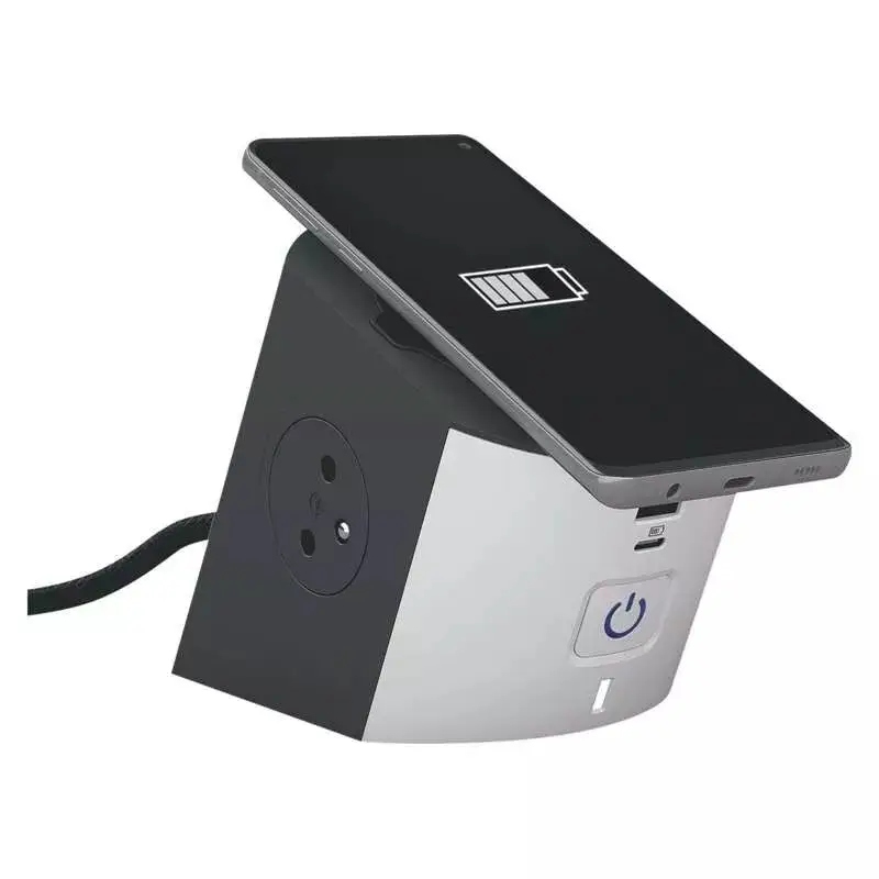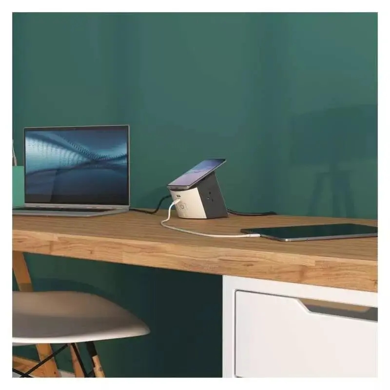 Stacja ładująca w zasięgu ręki, kompaktowa i praktyczna z ładowarką indukcyjną, idealne rozwiązanie do biura lub domu. Przedłużacz z 2 gniazdami podtynkowymi w standardzie francusko-belgijskim 2P+E, 16A, 230V, 3680W. Platforma indukcyjna Qi 10,0 W z antypoślizgową powierzchnią i wskaźnikiem naładowania. Polecany do smartfona w etui ochronnym