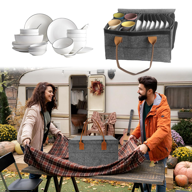 ▶Elastyczne przegródki z ochroną przed zarysowaniami: Bardziej elastyczne niż pianka - bez dźwięków kwaku. Brak cichszego dźwięku: kempingowy uchwyt na kubek wykonany jest z filcu pochodzącego z recyklingu, który może pomieścić 4 filiżanki - 8 talerzy. Można przechowywać okrągłe, kwadratowe, duże talerze i małe talerze - a nawet talerze do zupy!