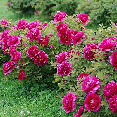 Piwonia drzewiasta to przepiękny i ceniony na całym świecie krzew dorastający nawet 2 m wysokości, liście zielone, pierzaste, duże skupione na szczytach pędów. Kwitnie intensywnie w maju, kwiaty pojedyncze lub podwójne koloru białego, różowego lub purpurowego o średnicy 12 – 20 cm.