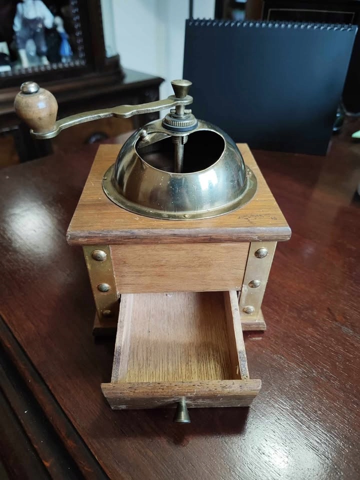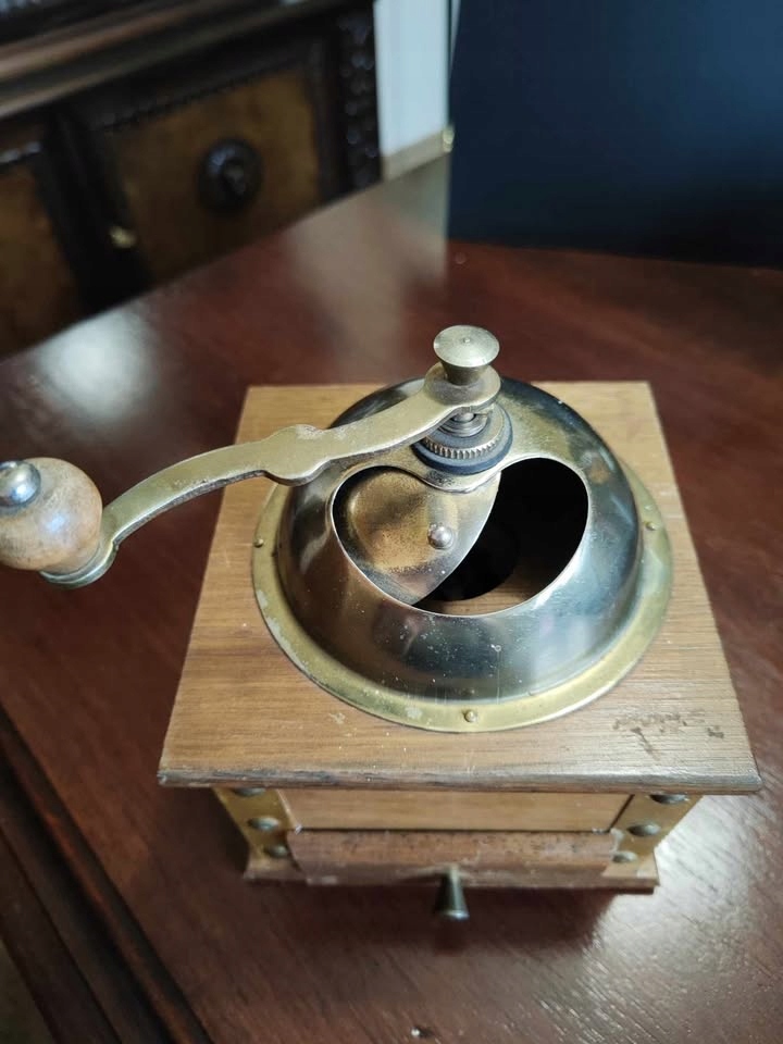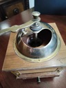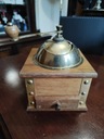 STARY DREWNIANY MŁYNEK DO KAWY NA KORBKĘ Z MOSIĘŻNYMI WSTAWKAMI, ŻARNA STALOWE, WYCIĄGANA SZUFLADKA.