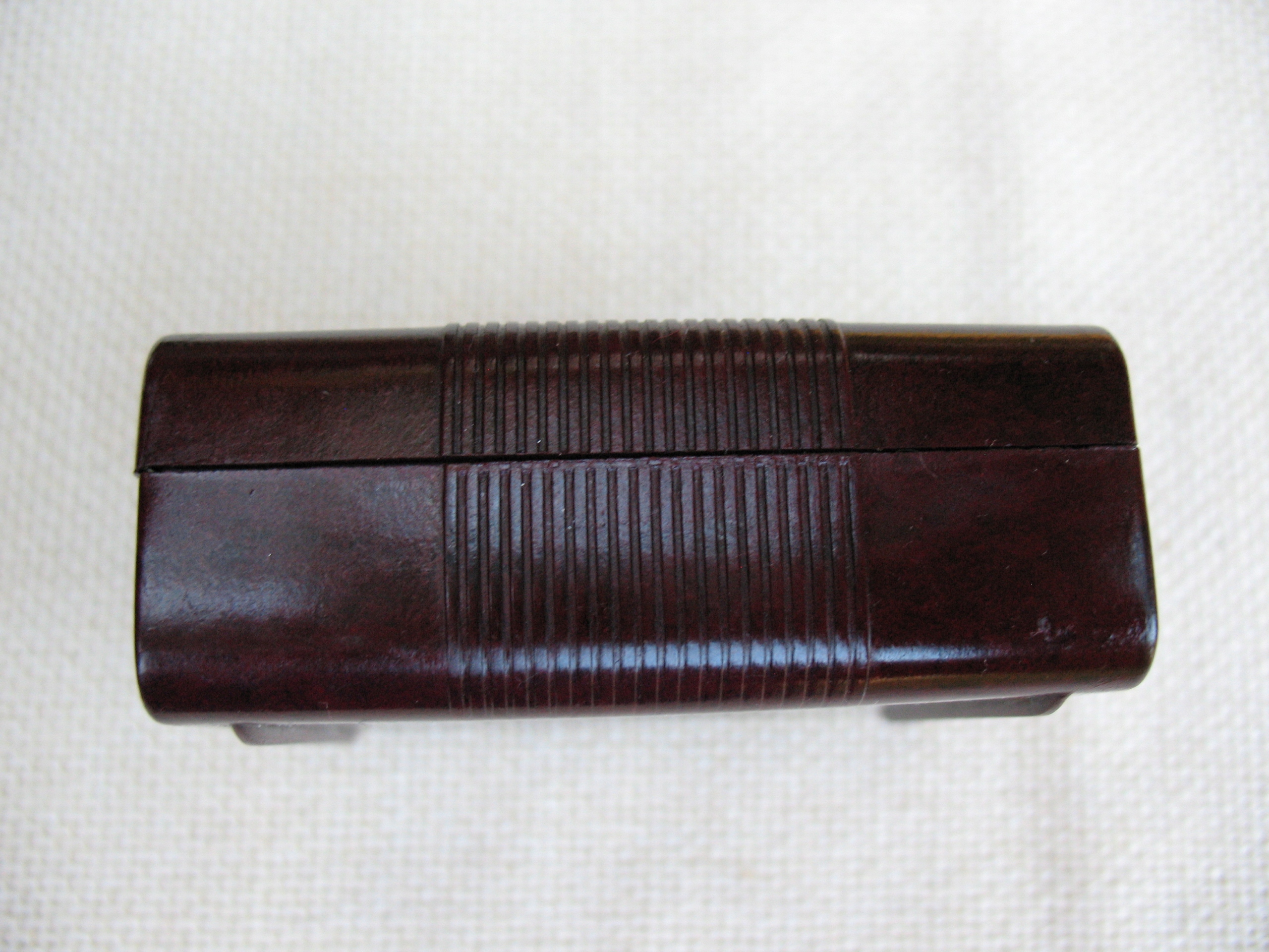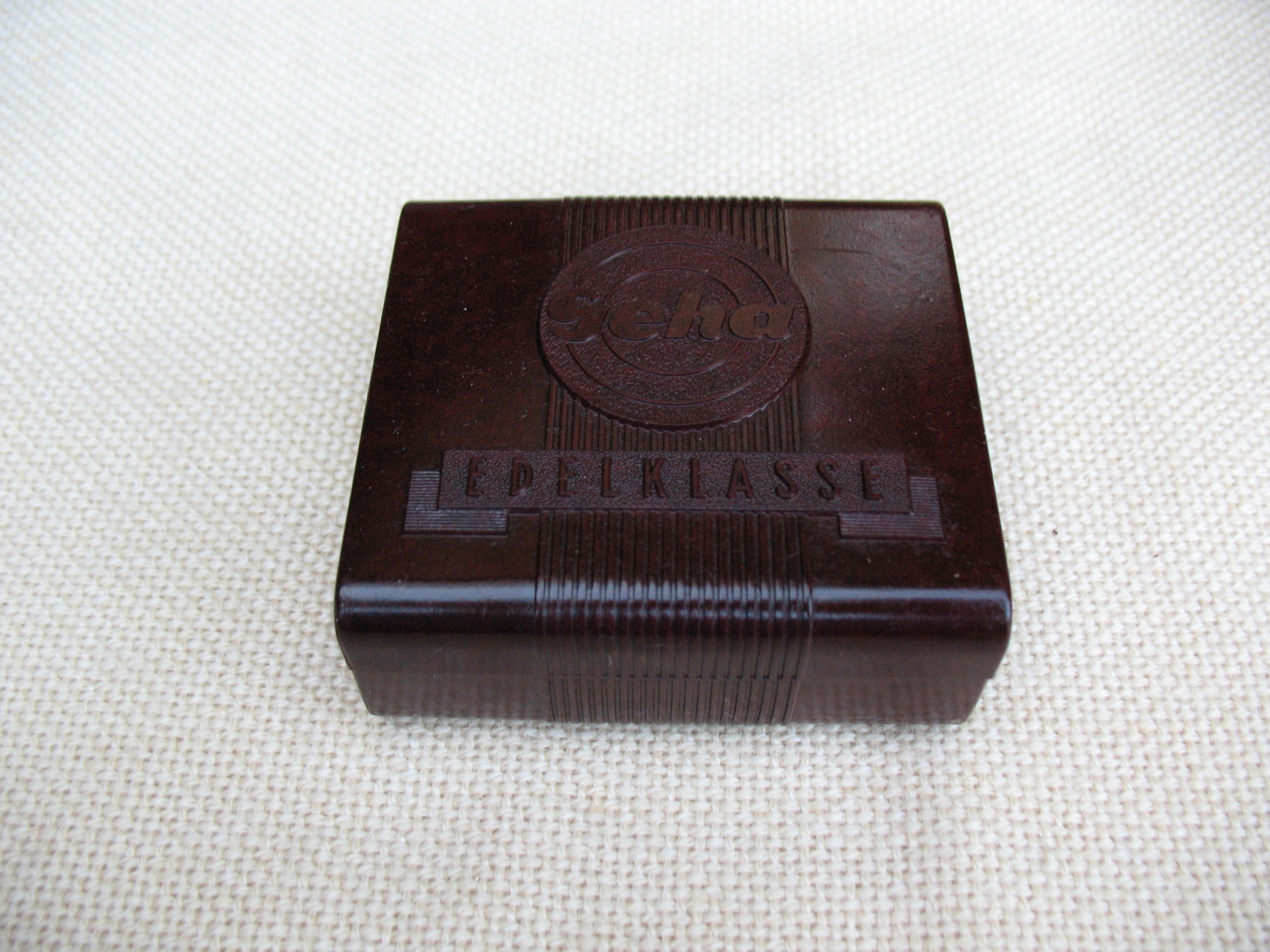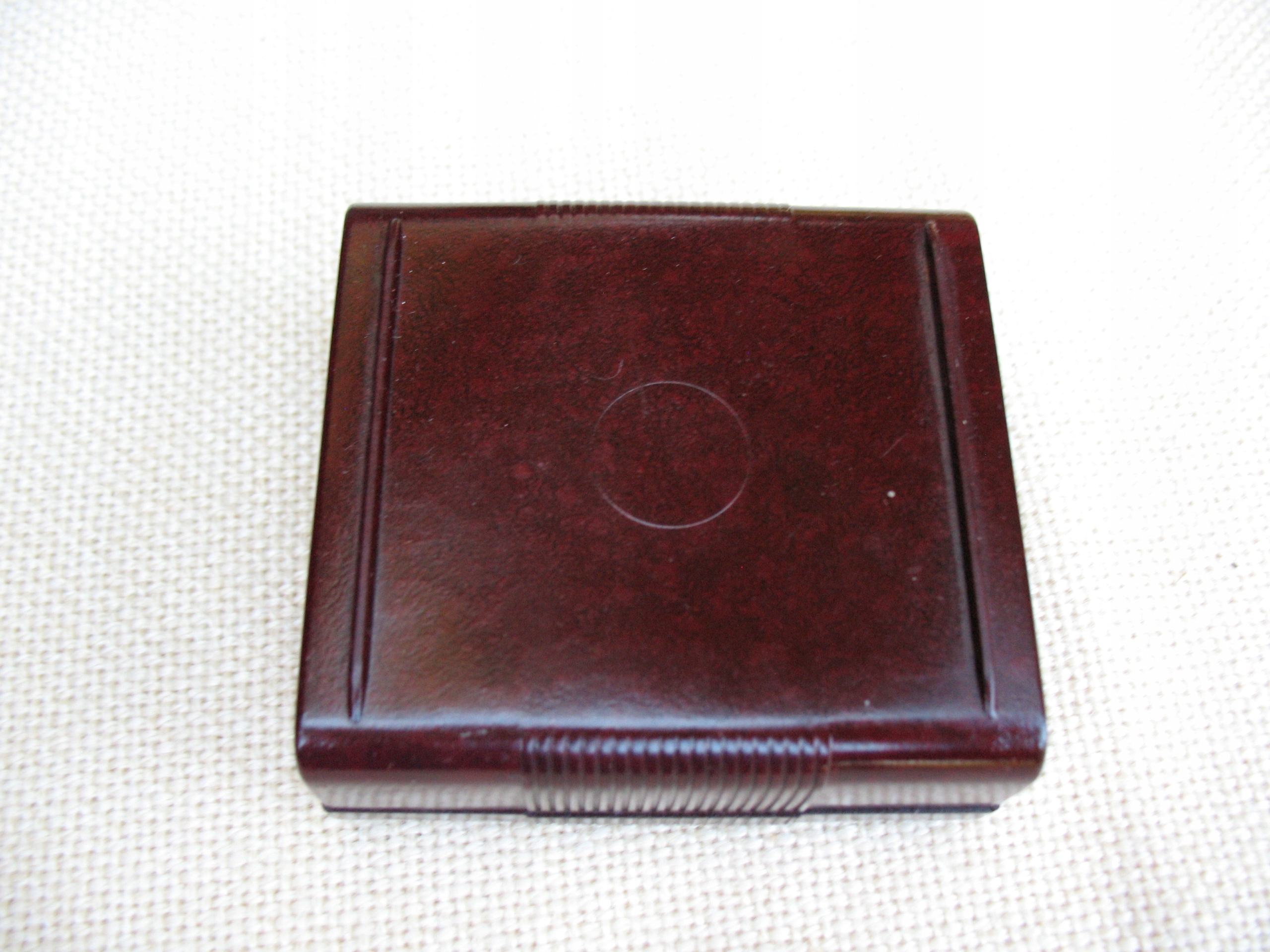 Stare, oryginalne, przedwojenne, puste pudełeczko na taśmę do maszyn piszących Geha. Oryginał. Przedmiot wykonany z bakelitu. Datowanie: lata międzywojenne. Wymiary: 67 x 72 x 29 mm. Stan zachowania: według mnie +db, niewielkie zabrudzenia, przytarcia, zarysowania, wszystko widoczne na skanach. Zapraszam do zakupów.