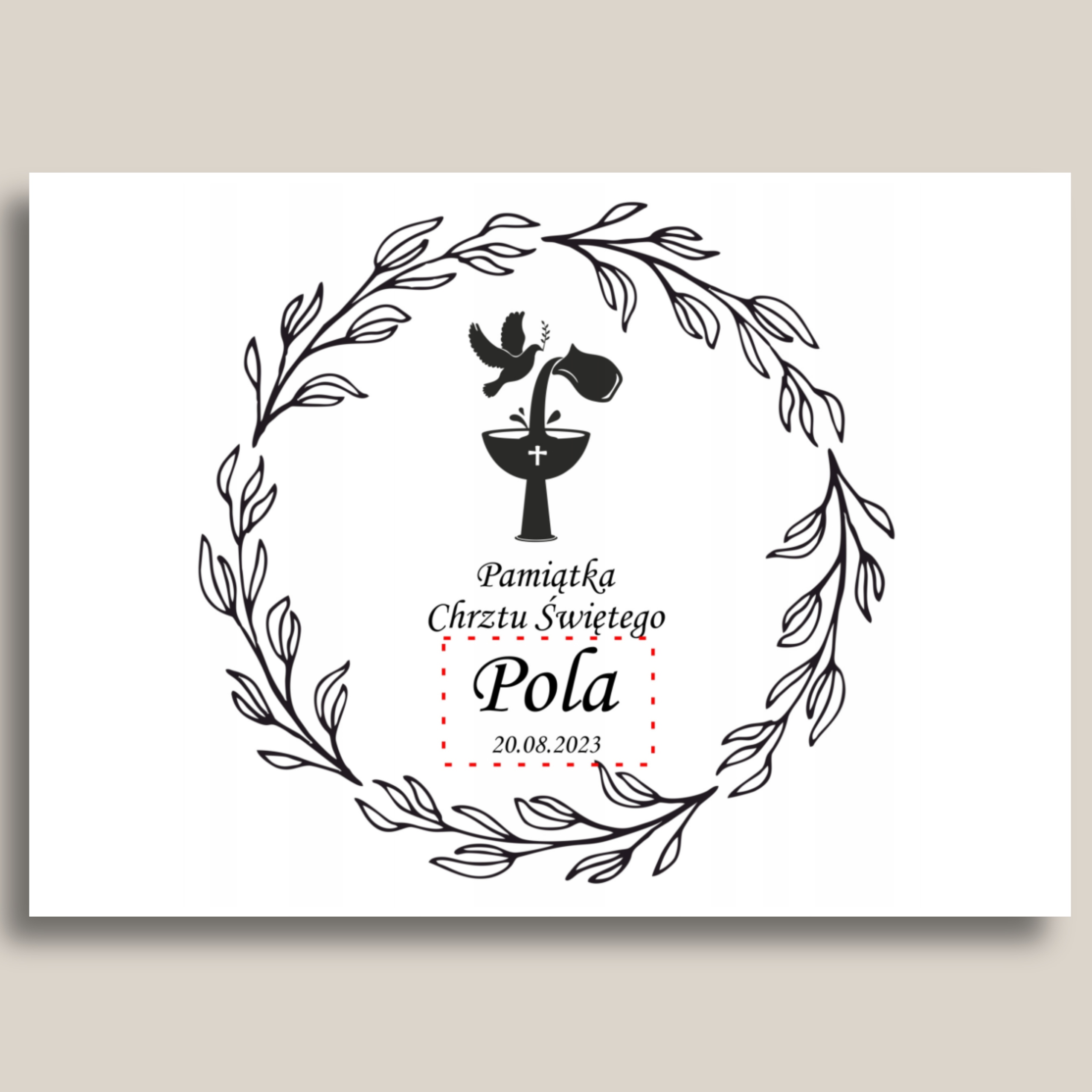 ❗️ Imienia dziecka w mianowniku (np. Klara, Kuba) oraz informację, czy mamy je odmienić na zewnątrz pudełka (np. Pamiątka Chrztu Świętego Klary) czy pozostawić w formie podstawowej (np. Pamiątka Chrztu Świętego Klara).