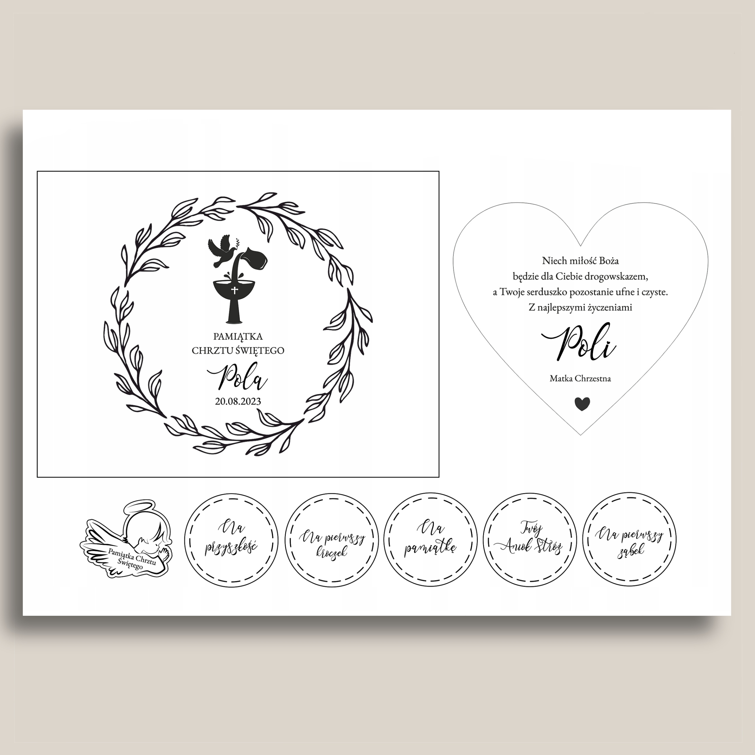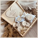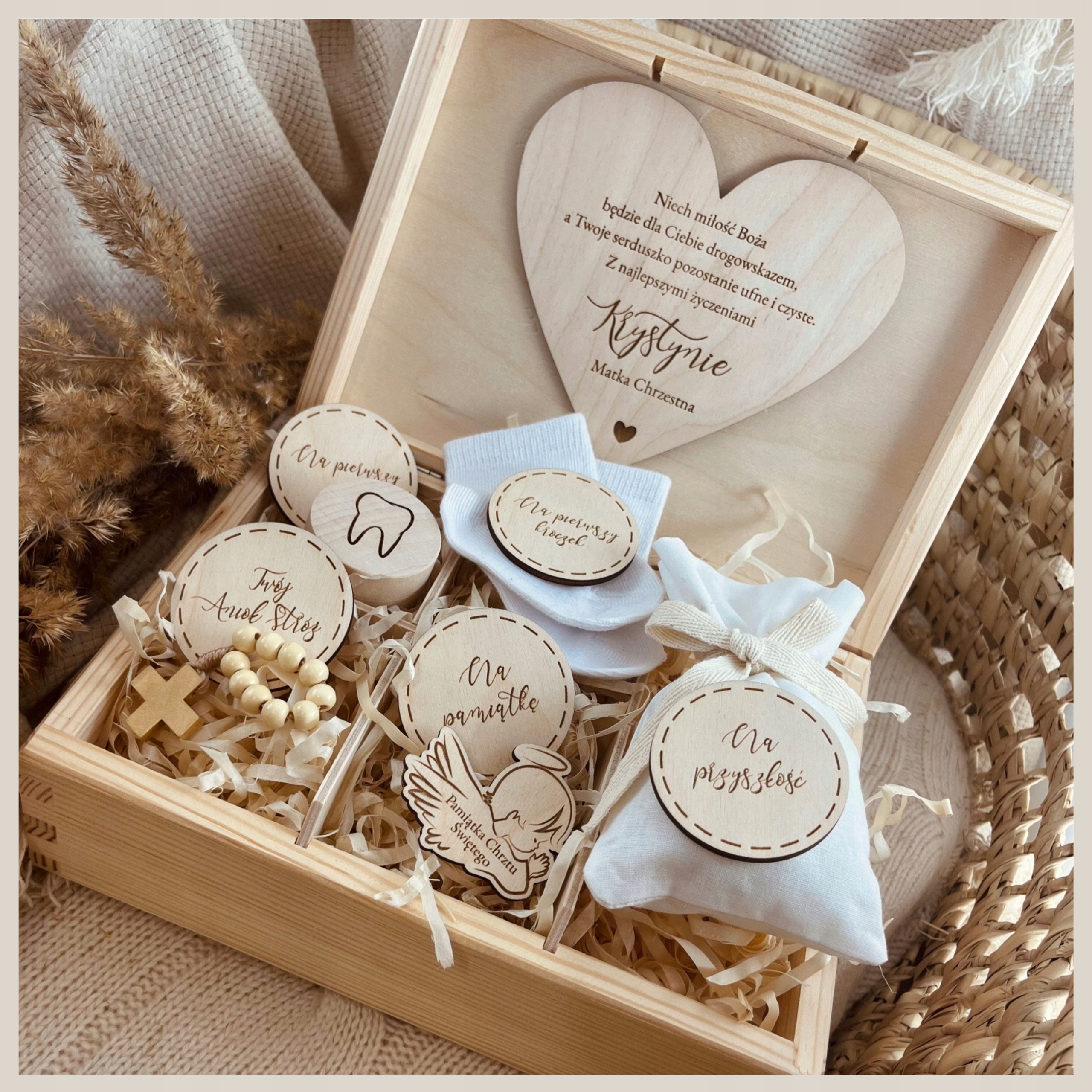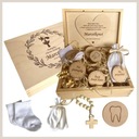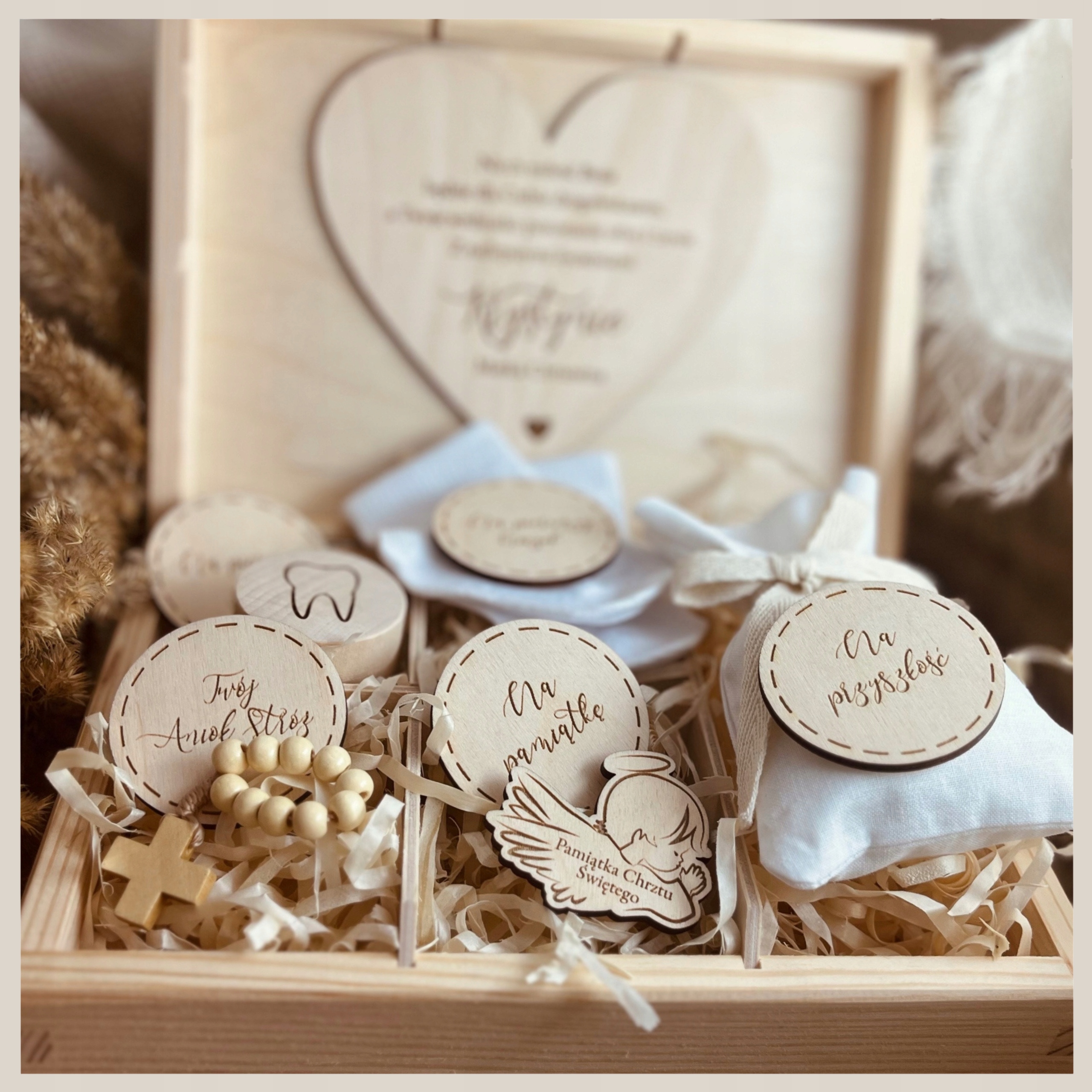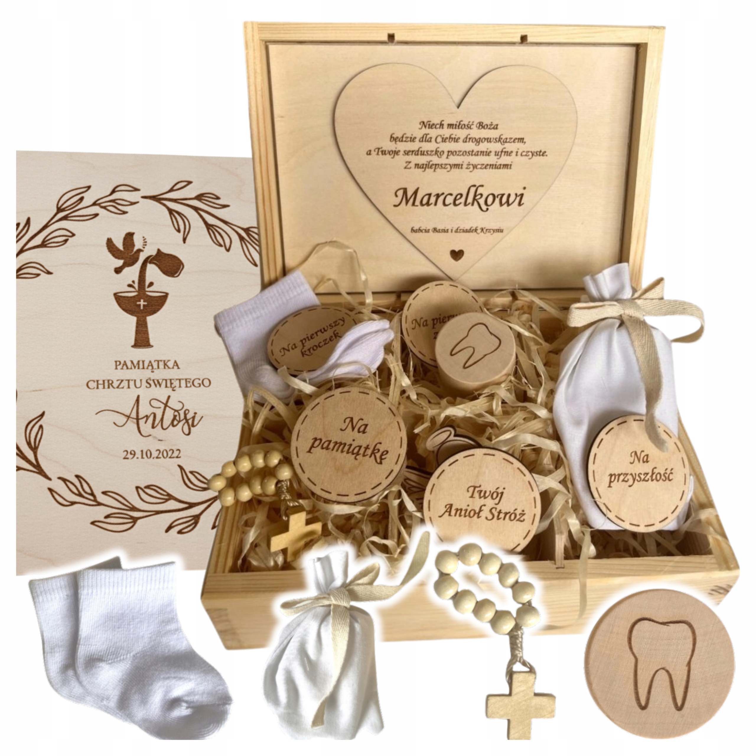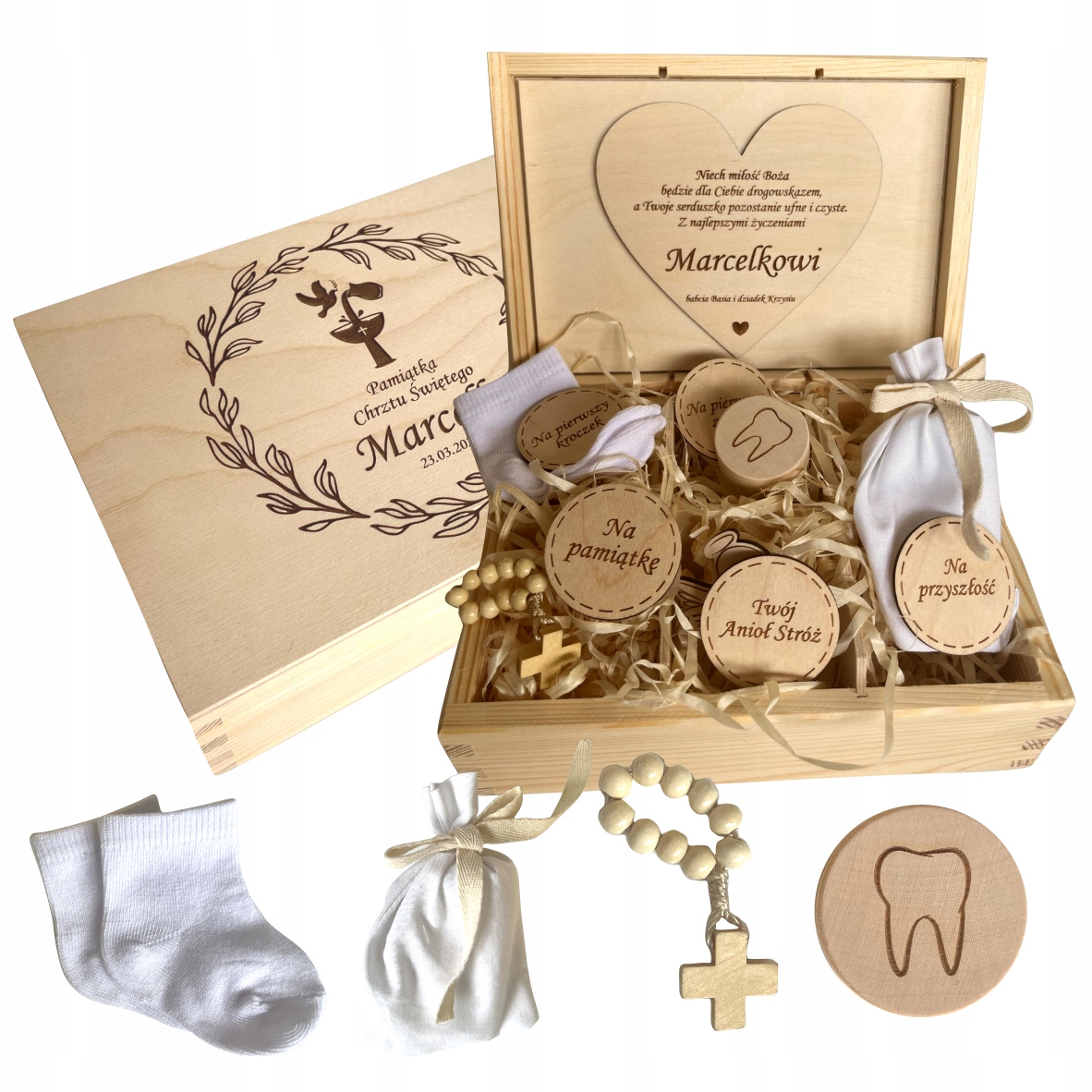 ✅ Na zewnętrznej stronie pudełka znajduje się wzór z imieniem dziecka i datą Chrztu Świętego.