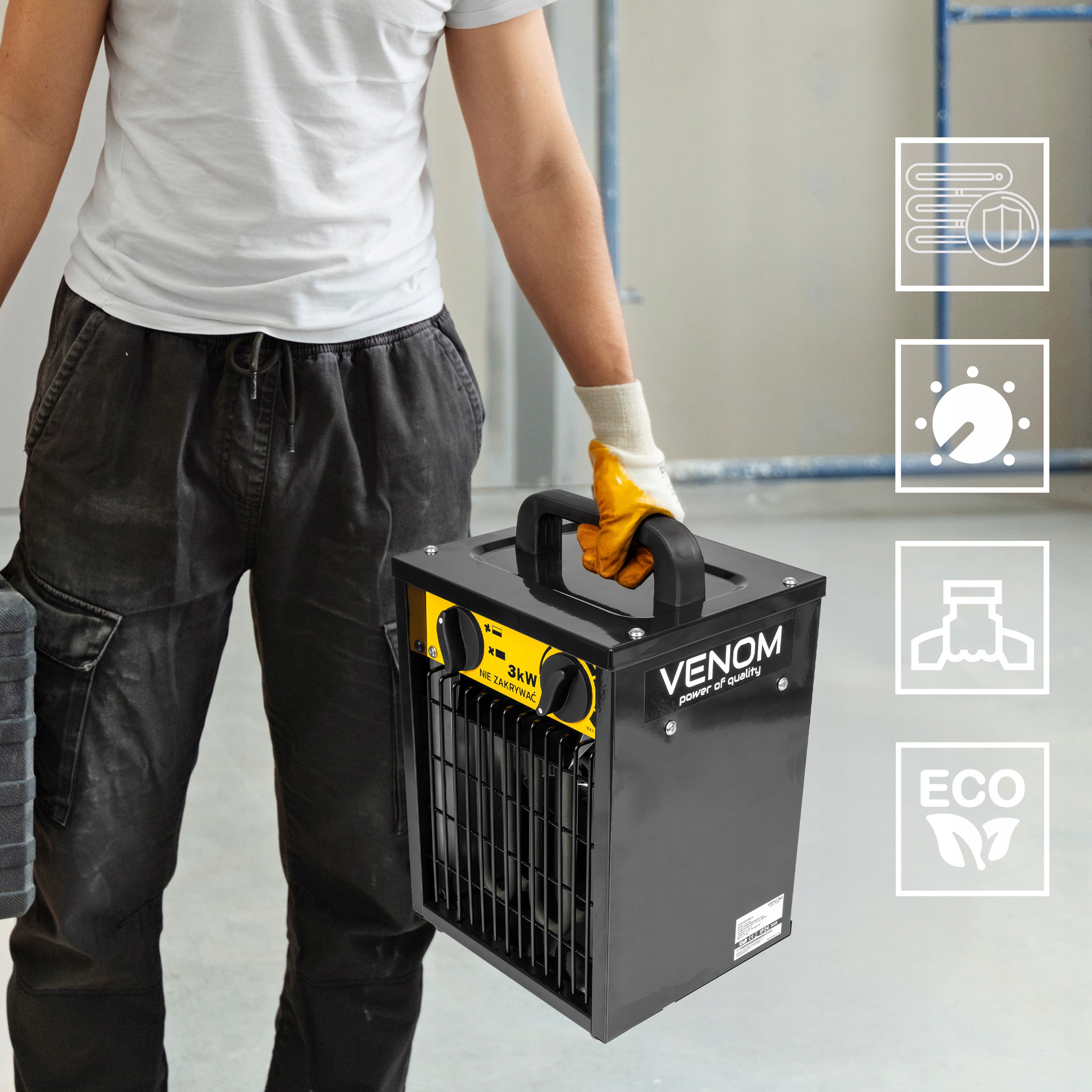 ✅ VENOM HeatFlow 3000™ – nagrzewnica elektryczna o mocy 3000 W, która błyskawicznie podnosi temperaturę w pomieszczeniu, zapewniając szybki komfort cieplny.
